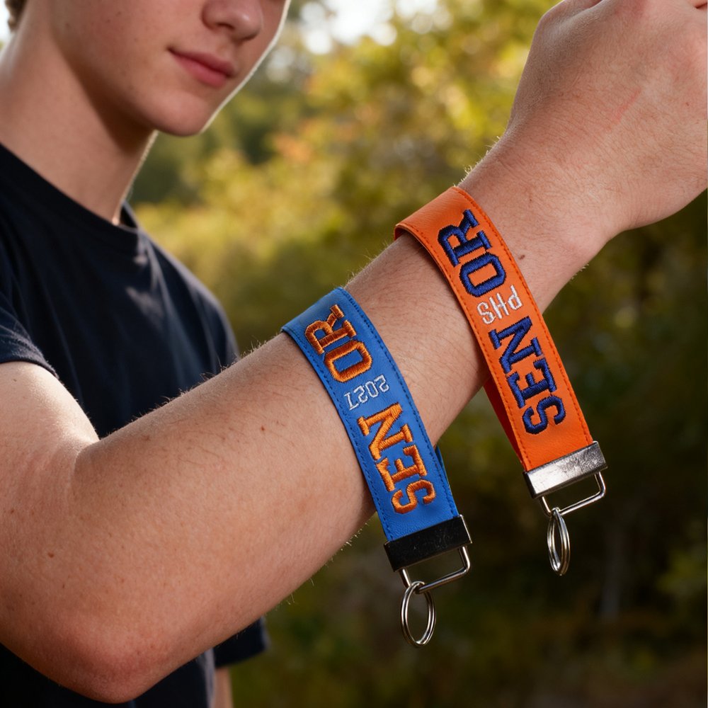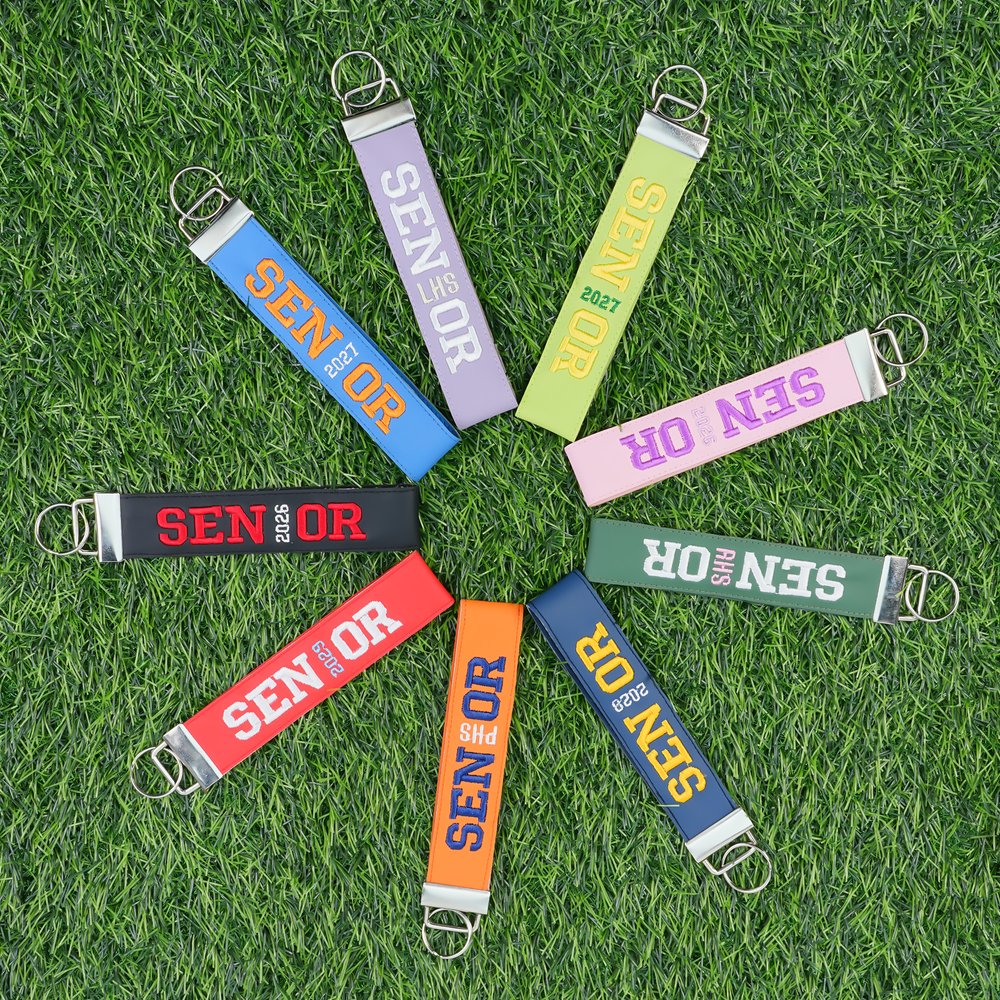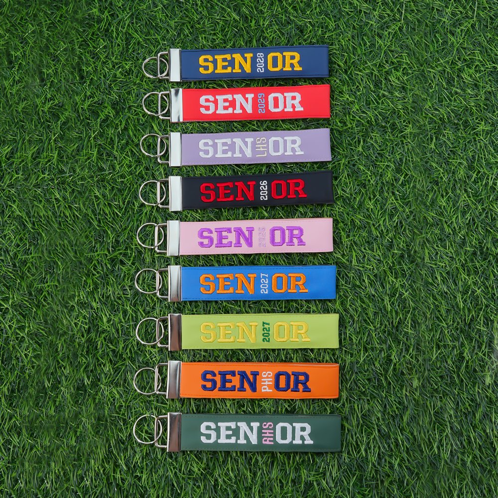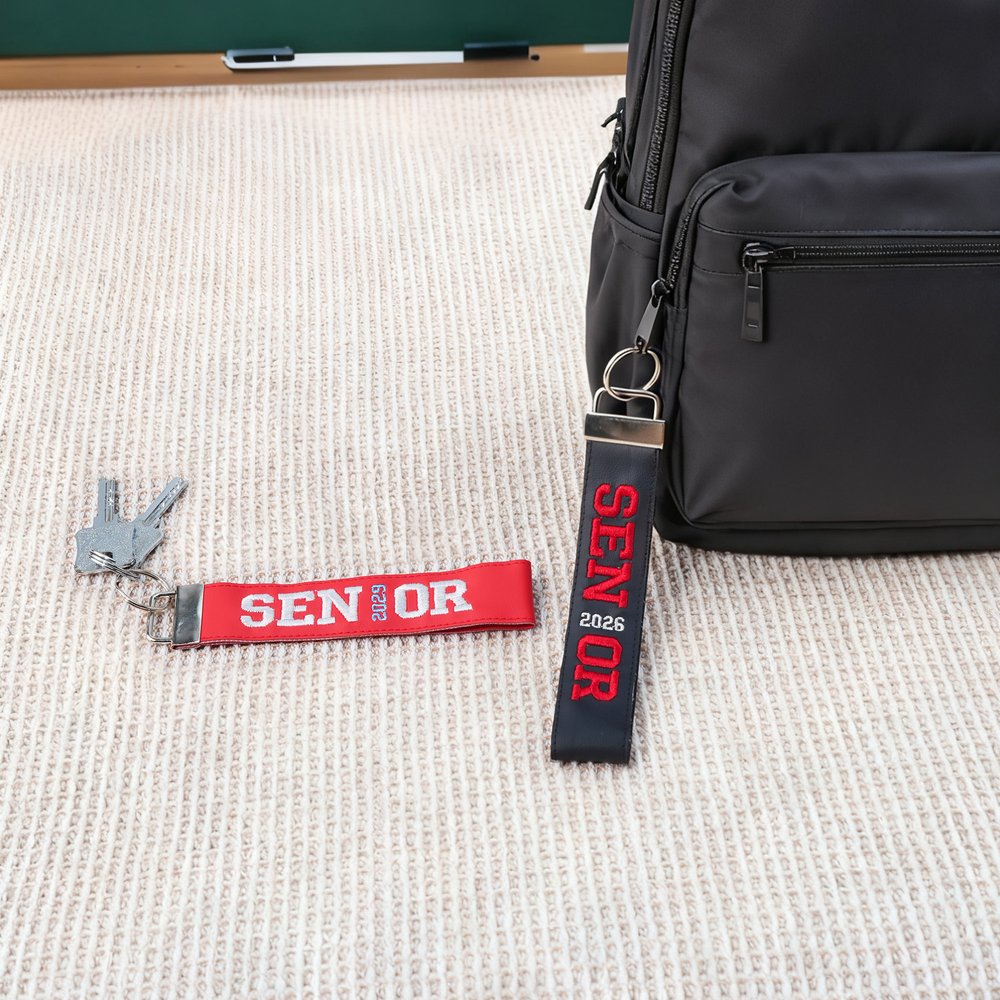 Deze sleutelhanger heeft vet geborduurd "SENIOR" met een aanpasbaar afstudeerjaar of schoolnaam en meerdere kleuropties. Het is ontworpen als een polsbandje om gemakkelijk te dragen, waardoor het een uniek, gepersonaliseerd accessoire wordt om het laatste jaar te vieren.