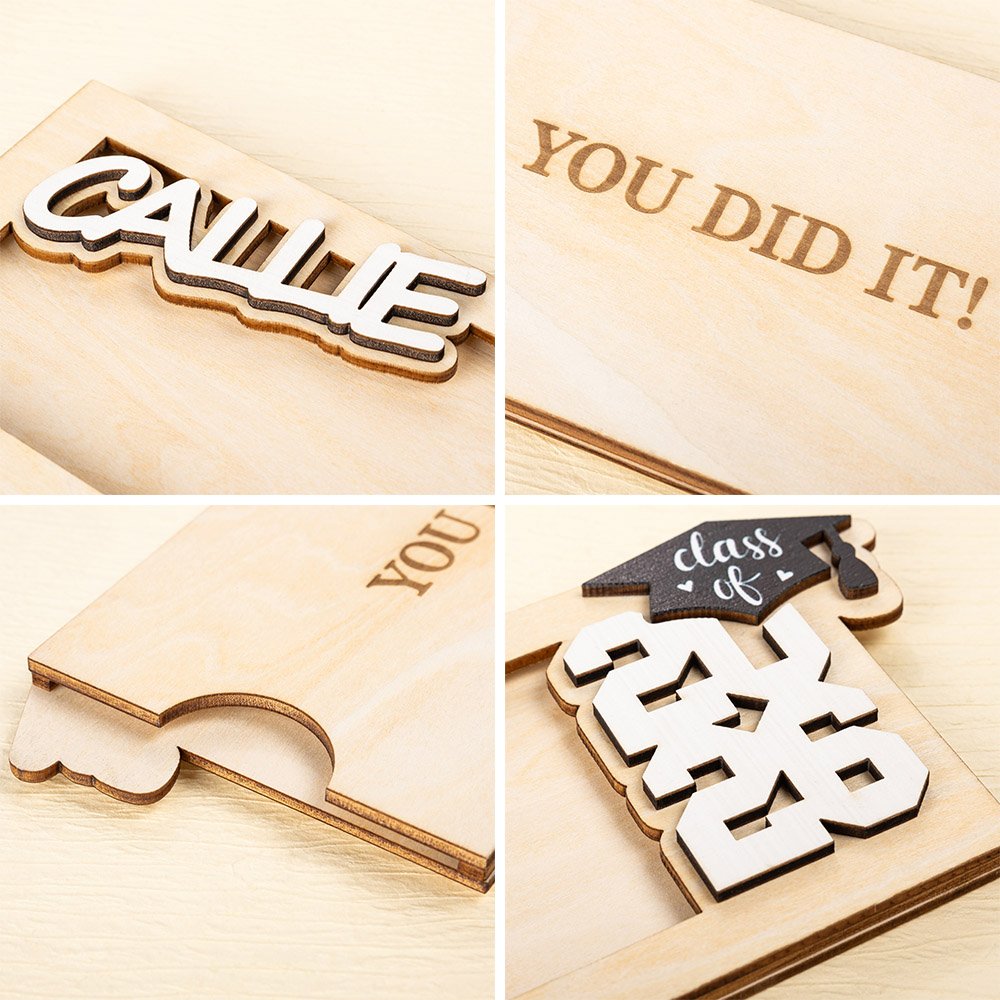 Deze geldhouder is niet alleen gemaakt van hout van hoge kwaliteit, maar is ook gemaakt om lang mee te gaan. De natuurlijke nerf en warme tinten van het hout voegen een vleugje rustieke charme toe, terwijl de gladde, gepolijste afwerking het een strak, modern uiterlijk geeft. Het graveer- en snijproces zorgt voor een scherpe, duidelijke weergave van de naam en het jaar van de klas van de afgestudeerde, waardoor het een duurzaam en dierbaar aandenken wordt.