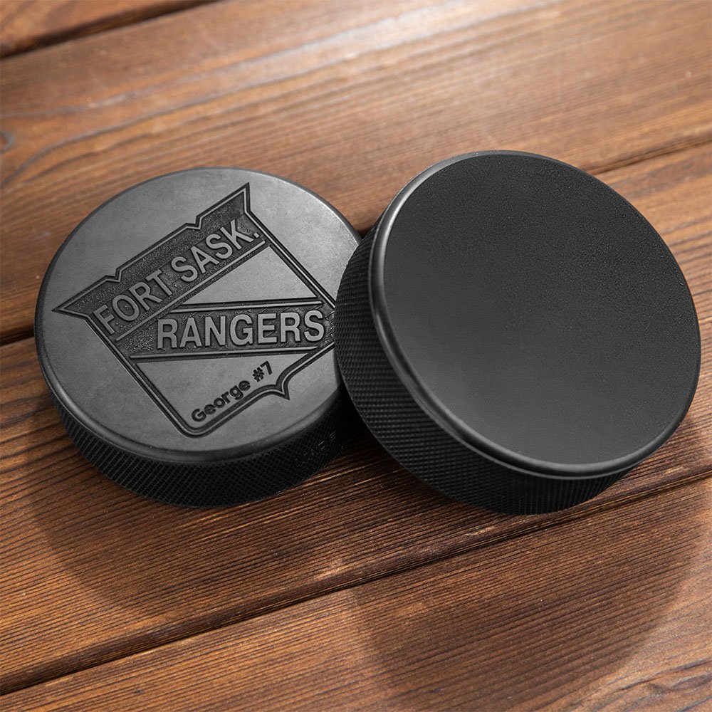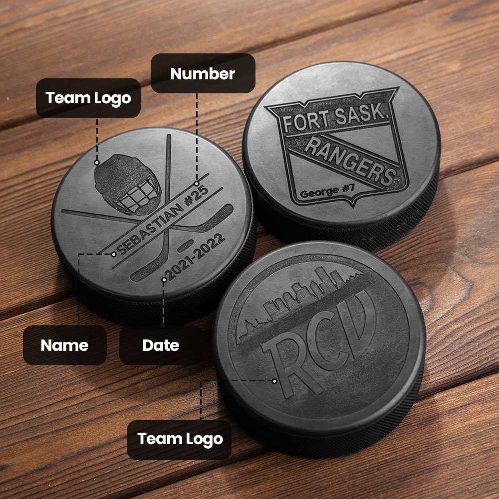 De op maat gegraveerde pucks kunnen je teamlogo, spelersnaam, nummer en jaartal bevatten! Een geweldig eindejaarsgeschenk voor spelers en coaches. De afbeelding wordt aan één kant van de puck gegraveerd.