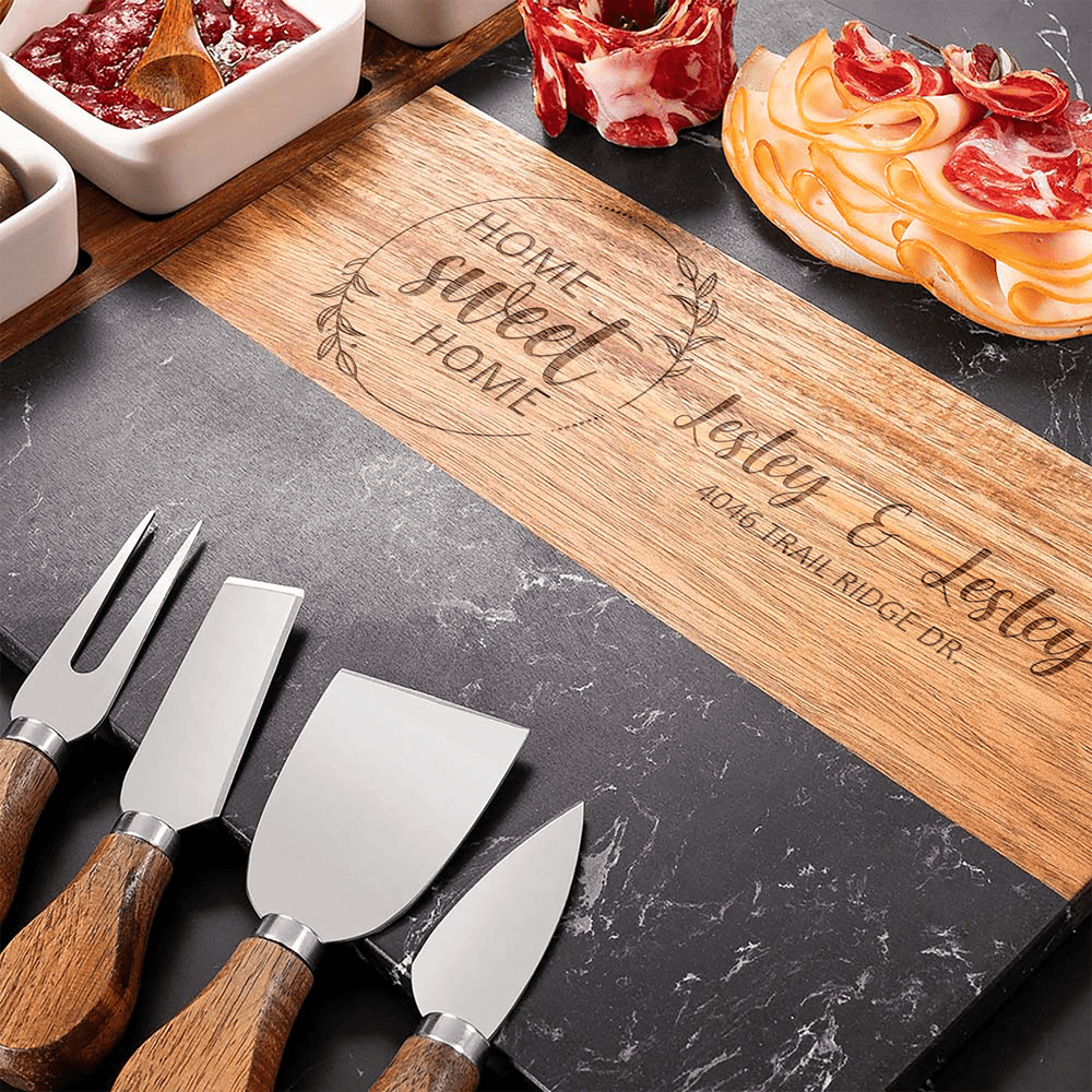 Deze 11-delige deli bord set is gemaakt van een combinatie van hoogwaardig marmer en acaciahout. De gladde glans van het marmer vult de natuurlijke nerf van het acaciahout aan, waardoor een harmonieuze mix ontstaat. Je kunt de set ook personaliseren met naam en tekst, waardoor praktisch keukengerei een persoonlijk aandenken wordt.