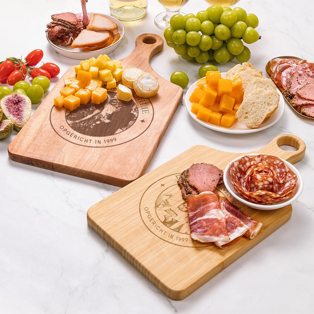 De snijplank is zorgvuldig gesneden met aangepaste herdenkingsfoto's van familieleden, wat niet alleen de warmte en samenhang van de familie laat zien, maar ook een diepe emotie legt in het dagelijks gebruik van keukengerei. Je kunt ook de datum en tekst op de snijplank aanpassen om hem nog specialer te maken. De snijplank behoudt de natuurlijke kleur en textuur van hout, walnoot, bamboe, mahonie en kersenhout 4 verschillende materialen en kleuren om je keuze te verrijken.