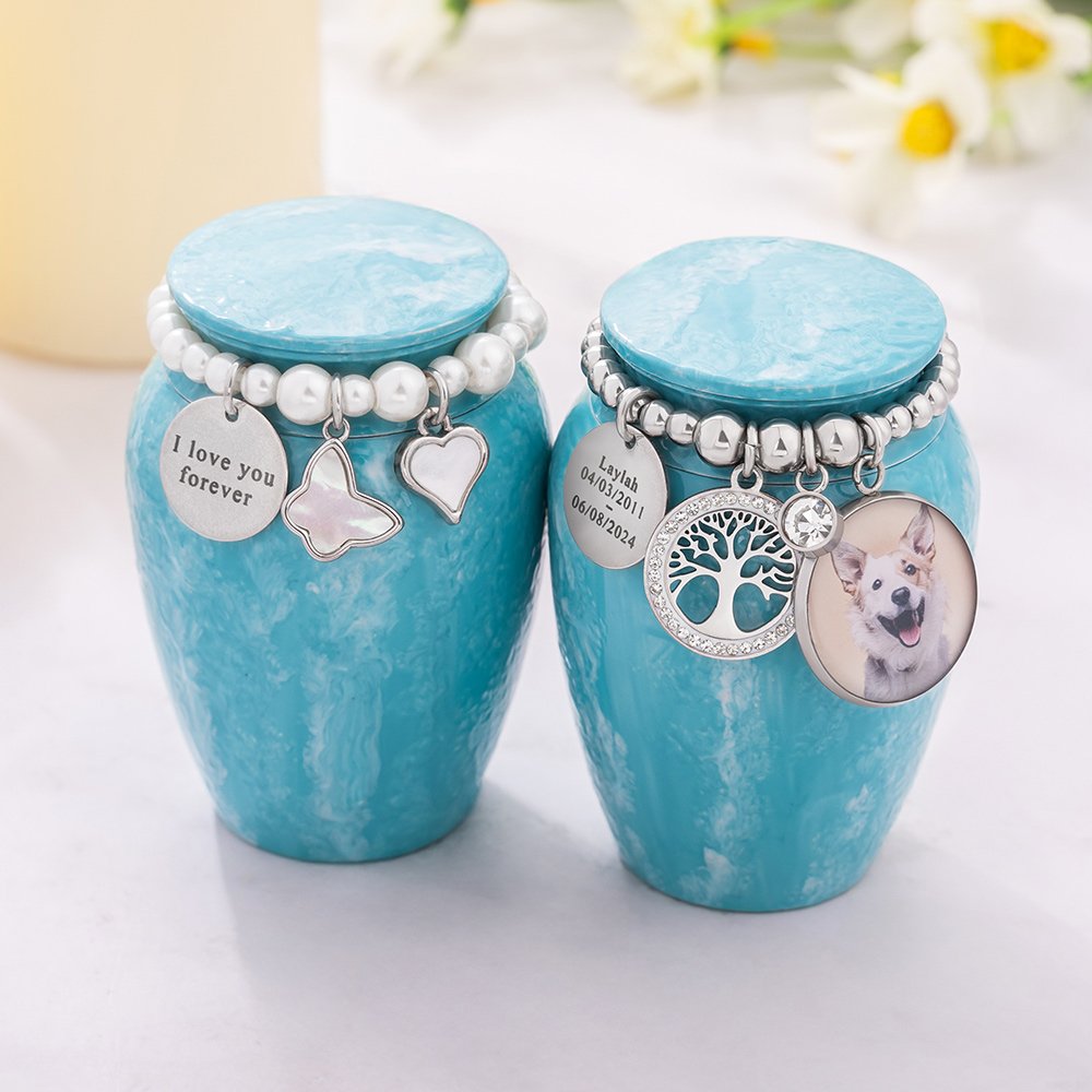 Deze prachtige mini urnbedel is verkrijgbaar in vijf prachtige stijlen, waaronder een hart, engelenvleugels, een levensboom, enz. Elk ontwerp is een hartelijk eerbetoon aan je dierbaren of huisdieren, waarbij hun herinnering op unieke wijze wordt bewaard.