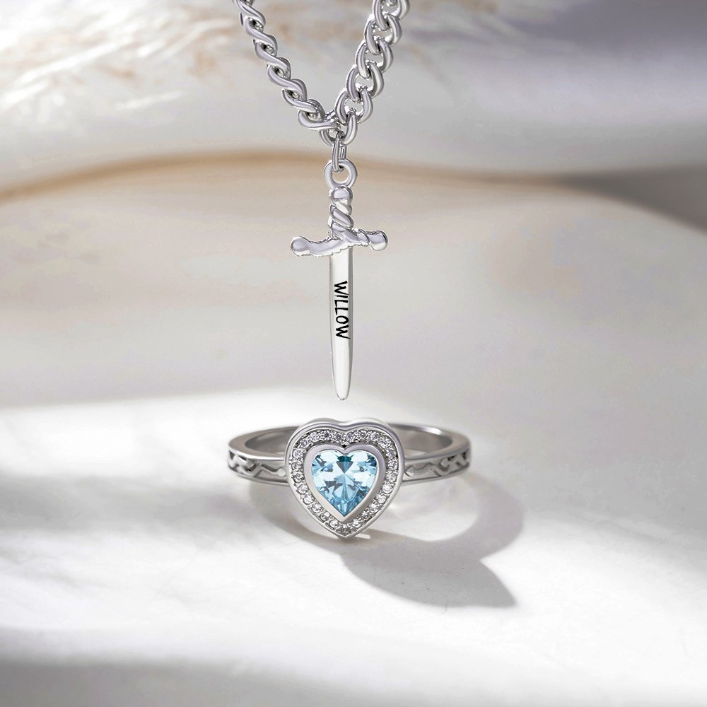 Deze hart en zwaard sieradenset is de perfecte combinatie van romantiek en kracht, gemaakt voor jou die op zoek is naar uniciteit en individualiteit. De set bestaat uit een prachtige hartvormige ring en een zwaardvormige armband. Elk sieraad heeft een diepe betekenis. Je kunt niet alleen je naam aanpassen, maar je kunt ook een geboortesteen kiezen om het nog unieker te maken.
