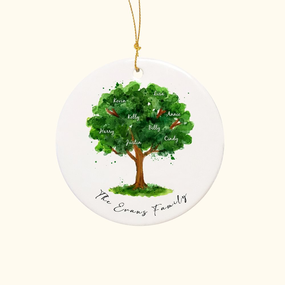 Ons kerstornament met familieboom is de perfecte kerstdecoratie om de sfeer van het festival te versterken. Dit ornament kan aan je kerstboom worden gehangen of in een andere ruimte van je huis worden opgehangen als een mooie decoratie. Je kunt de namen van 2-18 familieleden aanpassen, zodat je een unieke familieboom creëert die de band en liefde binnen je familie vertegenwoordigt.