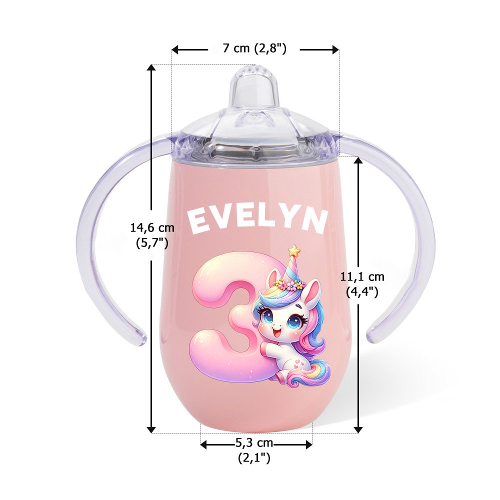 Ontworpen met schattige cartoonelementen, waaronder drie leuke patronen van eenhoorns, dinosaurussen en vrachtwagens, en met cijfers, voldoet het aan de voorkeuren van verschillende baby's en maakt het water drinken interessanter. Er is een speciale naamsaanpassingsservice om een exclusieve babybeker te maken, die niet alleen verwarring met andere kinderbekers voorkomt, maar ook een gevoel van saamhorigheid en plezier geeft!