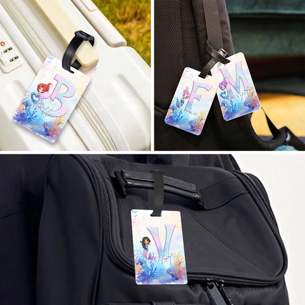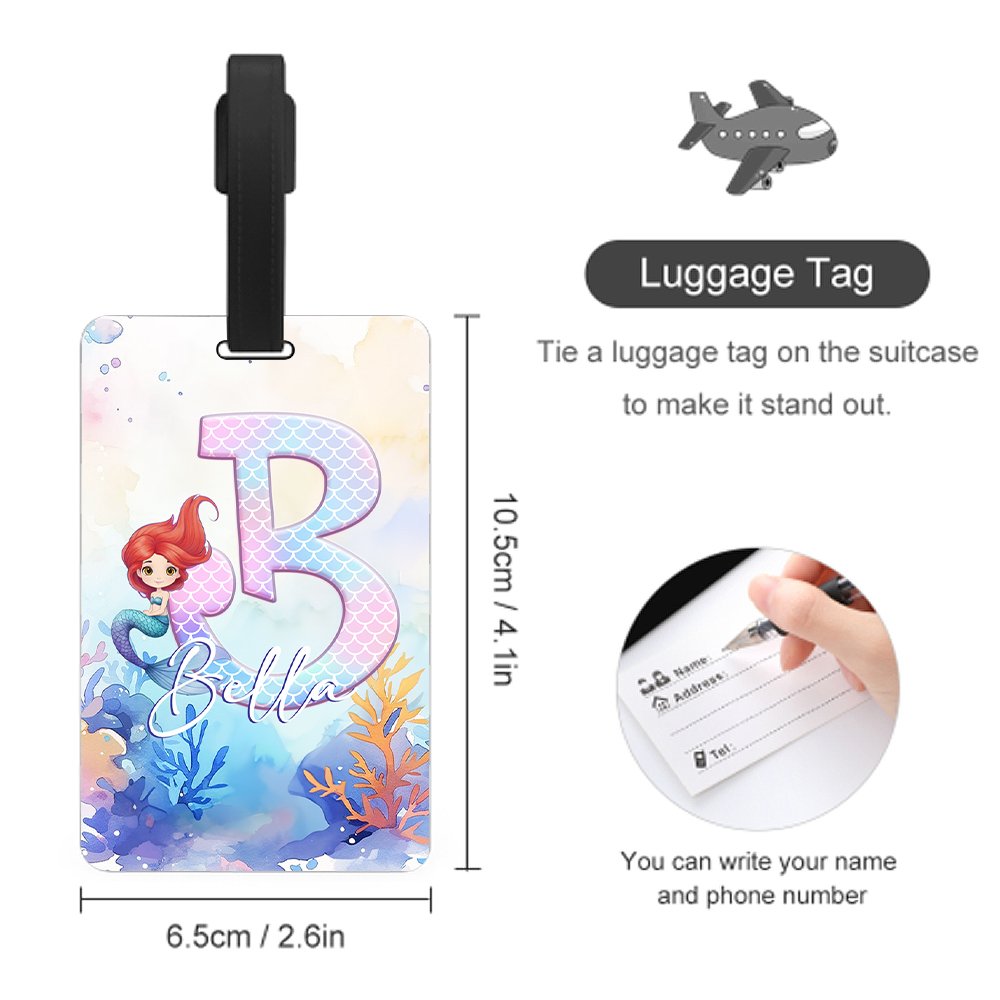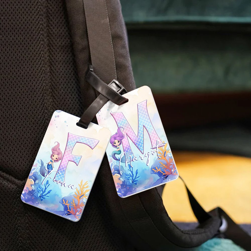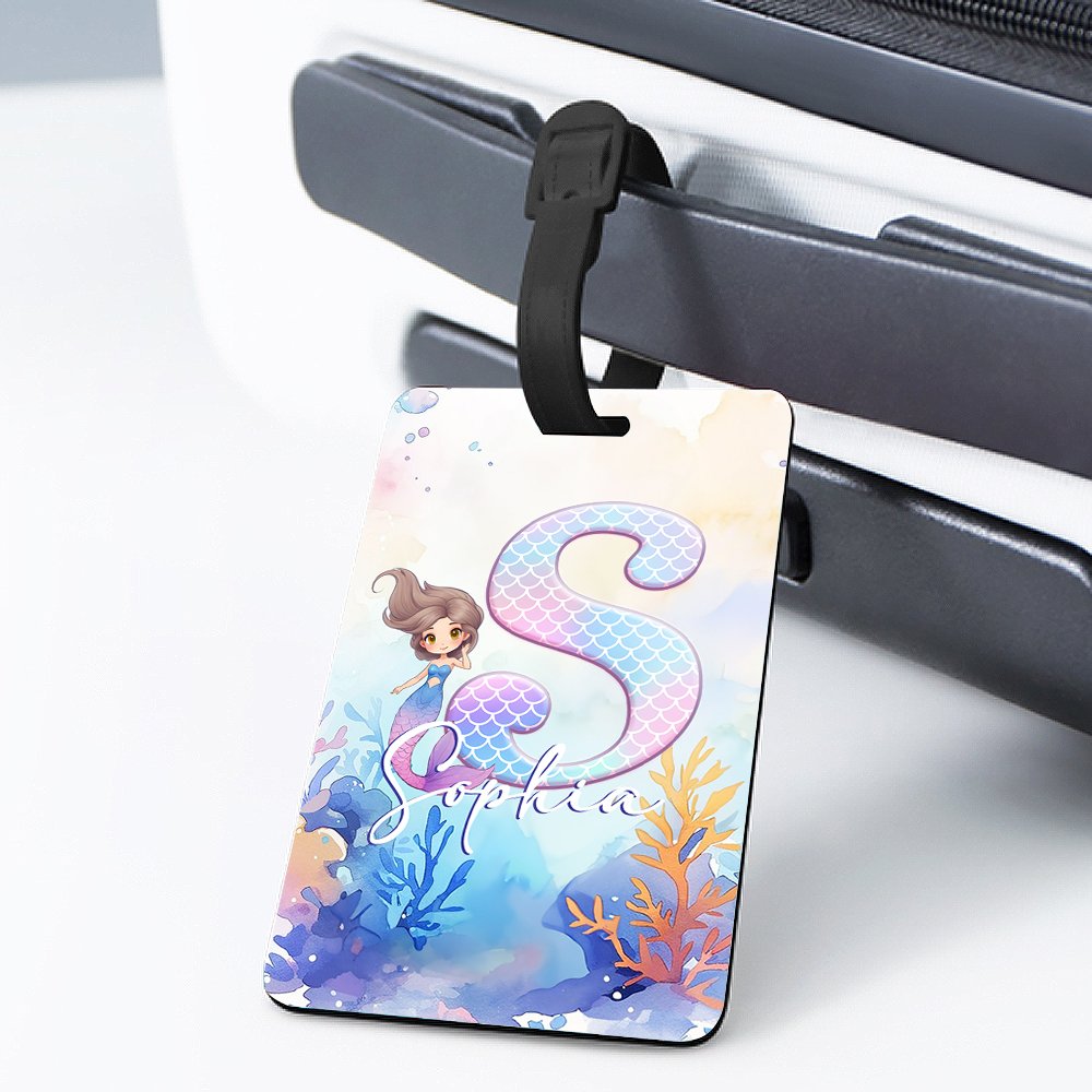 De bagagelabel is geïnspireerd op de mysterieuze en prachtige onderwaterwereld en combineert de glanzende zeemeerminelementen met zachte kleuren tot een unieke bagagelabel met een sprookjesachtige sfeer en artistieke zin. Je kunt kiezen uit 3 zeemeermin houdingen en hun afbeeldingen aanpassen. Je kunt ook de naam en initialen van je kind aanpassen om een persoonlijk product te maken.