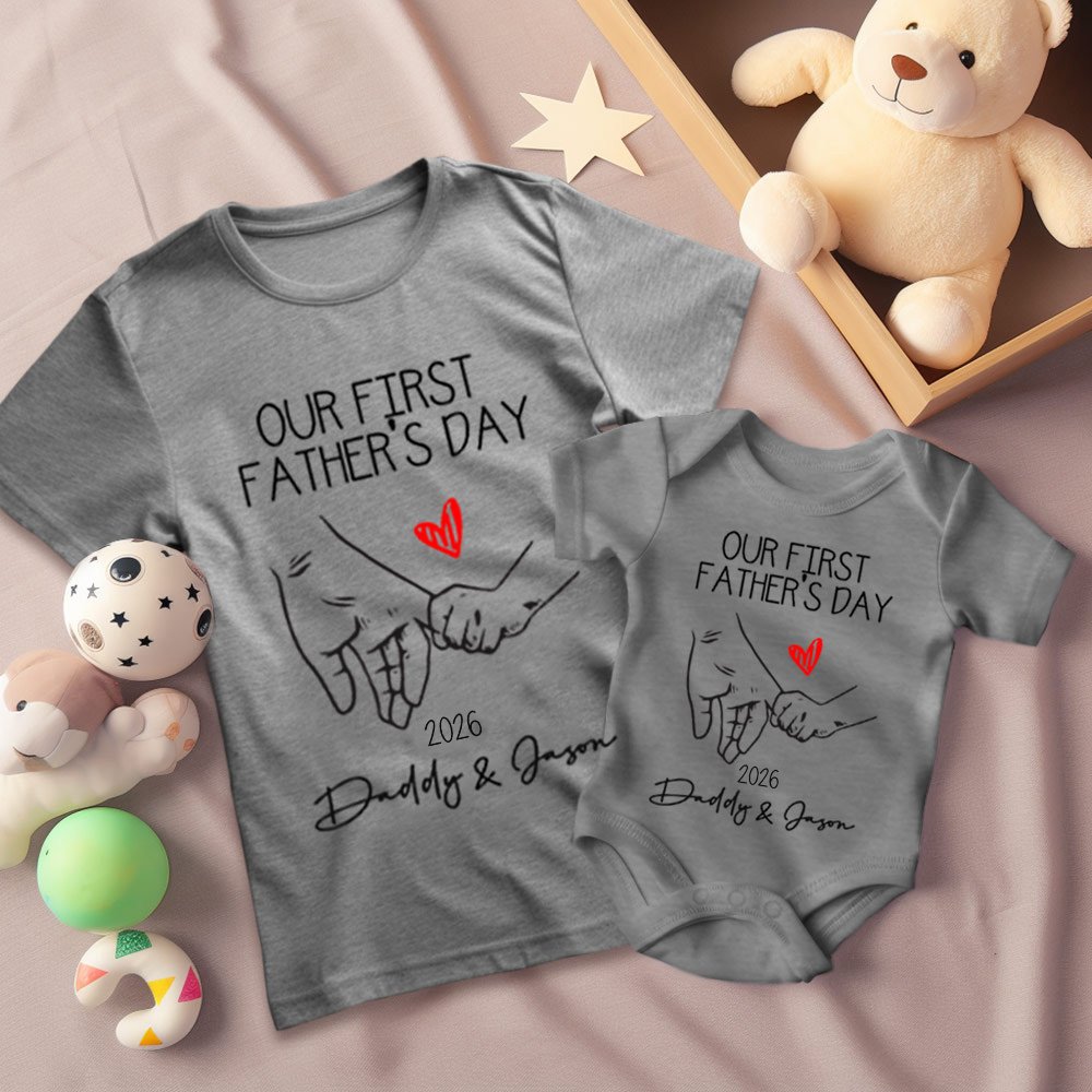 Als je op zoek bent naar een speciaal cadeau voor Vaderdag, dan is onze gepersonaliseerde vader en zoon die elkaars hand vasthouden outfit een perfecte keuze. Dit shirt is niet alleen een attent cadeau, maar ook een unieke manier om jullie eerste Vaderdag samen te vieren. Je kleintje zal er schattig uitzien in hun bijpassende shirt en jullie zullen allebei trots zijn om jullie band te laten zien.
