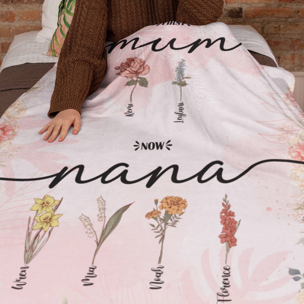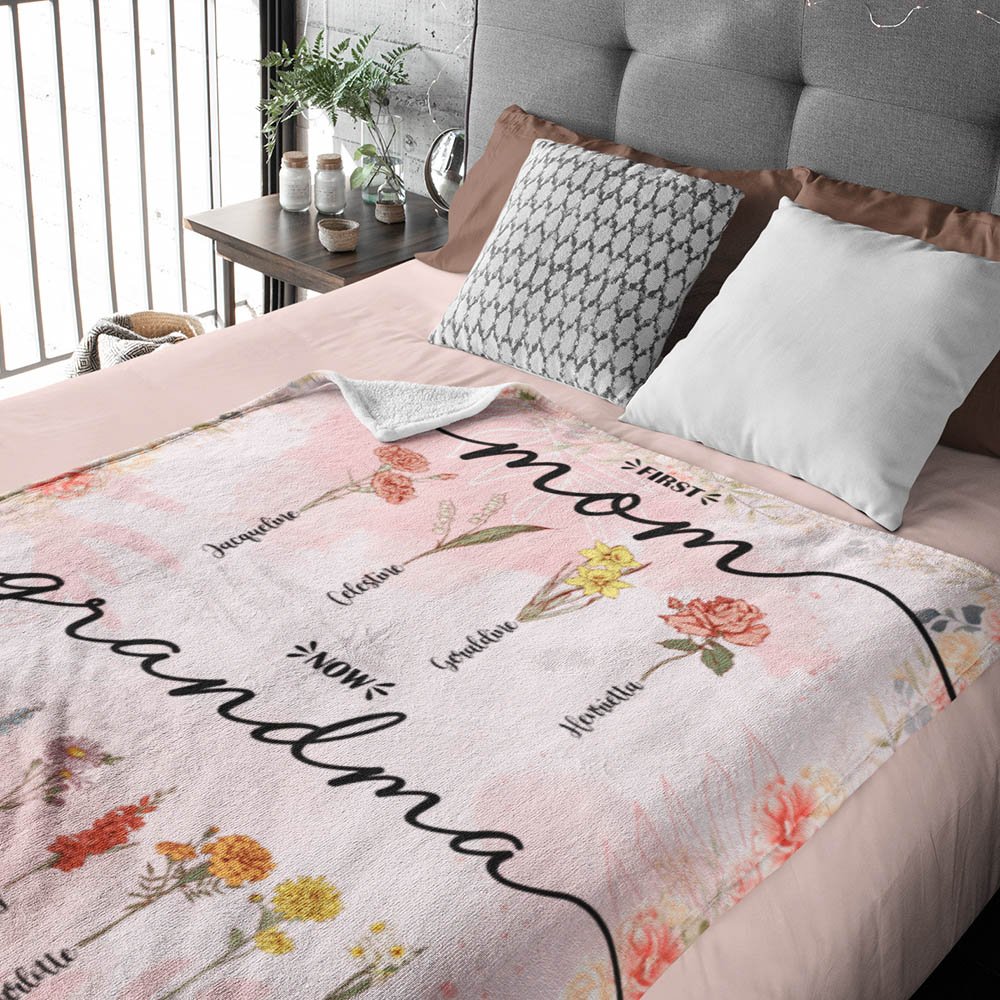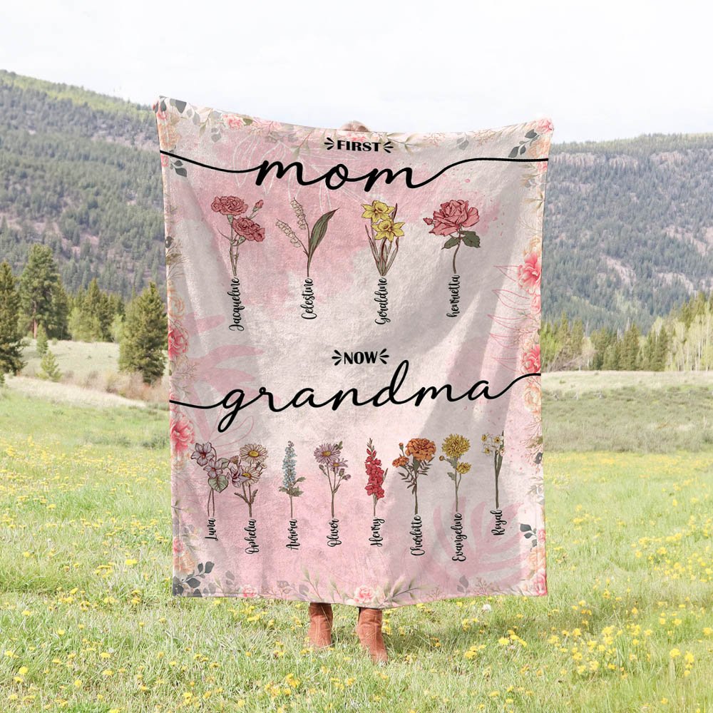 Met de First Mom Now Grandma geboortebloemdeken kun je de geboortebloemen en namen van je kinderen en kleinkinderen aanpassen, zodat er een mooie en betekenisvolle band ontstaat tussen elk familielid. Dit persoonlijke tintje viert de grootsheid van een grootmoeder of moeder en laat haar weten dat ze gekoesterd, geliefd en bewonderd wordt.