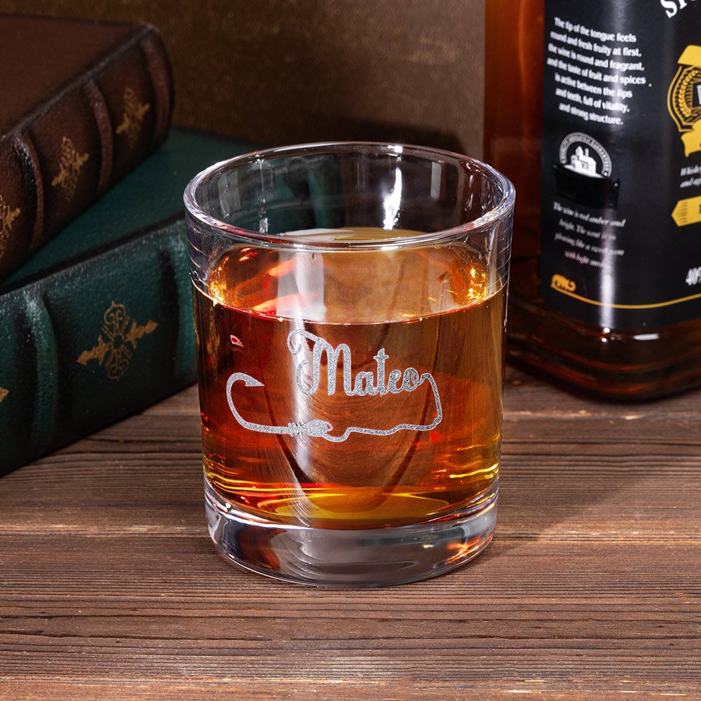 Dit whisky whiskyglas is voorzien van een klassieke vishaakafbeelding, die staat voor de geliefde activiteit vissen. De aangepaste naam voegt een speciaal tintje toe, waardoor het glas uniek is en is afgestemd op de smaak van de ontvanger.