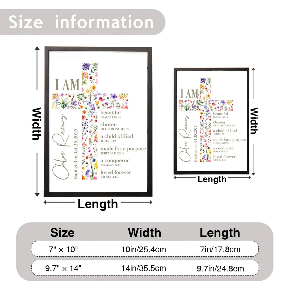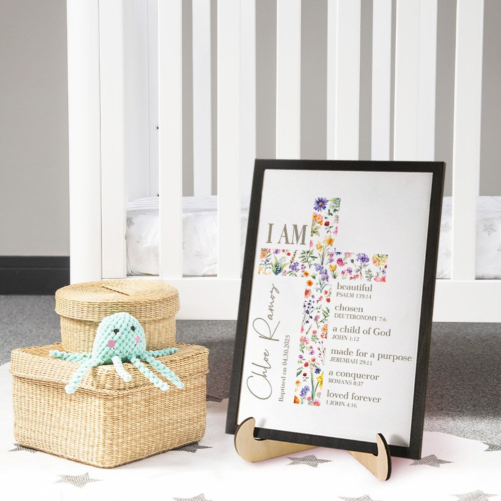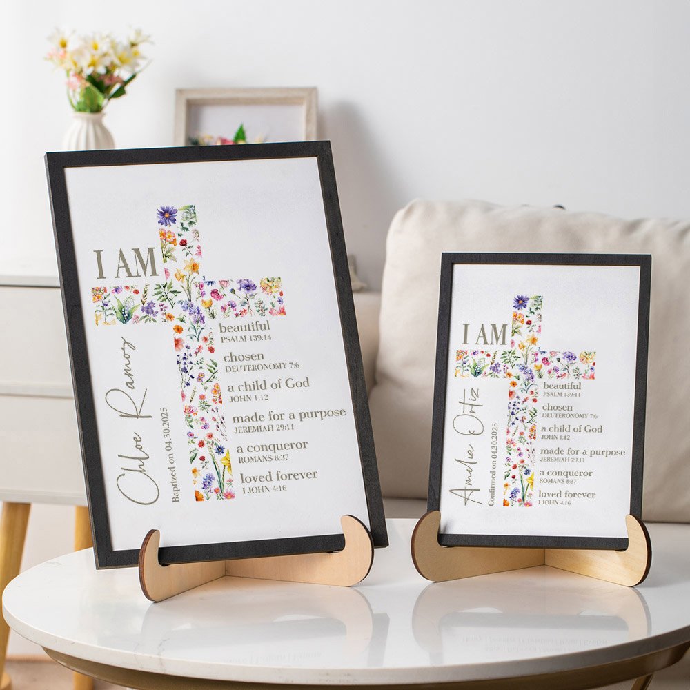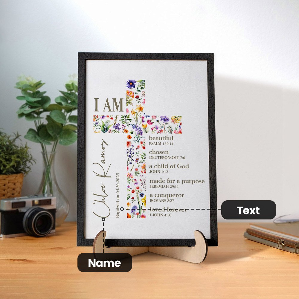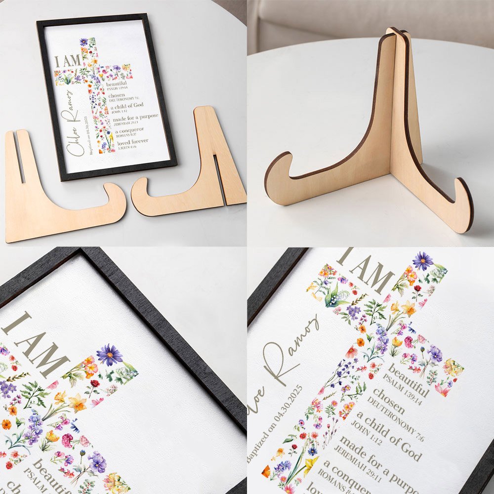 Onze houten lijst gebruikt bloemenelementen om een kruispatroon te vormen dat kleurrijk en aantrekkelijk is. Het houten frame is ook bedrukt met positieve woorden, "Ik ben mooi, uitverkoren, een kind van God, gemaakt voor een doel, een overwinnaar, geliefd voor altijd," Deze teksten worden geciteerd uit verschillende passages in de Bijbel en drukken persoonlijke overtuigingen uit. Dit houten frame kan ook worden aangepast met namen en tekst naar wens, waardoor het nog gedenkwaardiger wordt.