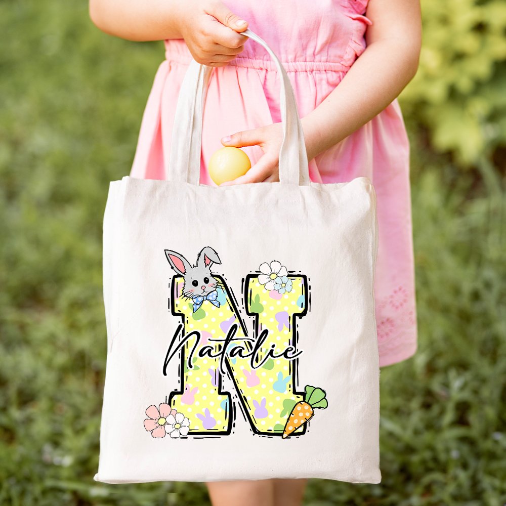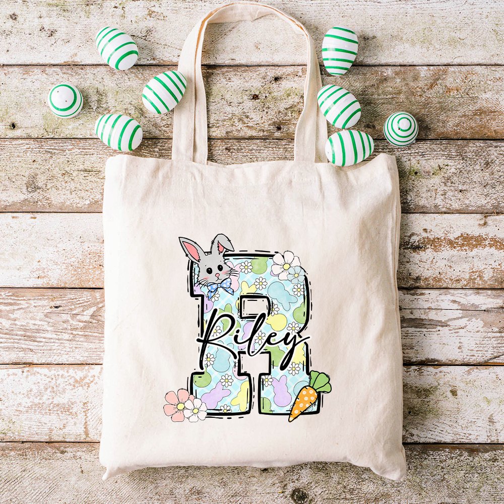 Het ontwerp van deze canvas tas zit vol feestelijke vrolijkheid. De canvas tas is puur wit, bedrukt met een levendig en lieflijk paashaas-initialenpatroon, versierd met kleurrijke bloemen rondom en de tas kan ook worden aangepast met de naam van het kind. Dit ontwerp draagt niet alleen bij aan het plezier van Pasen, maar maakt elke tas ook uniek.