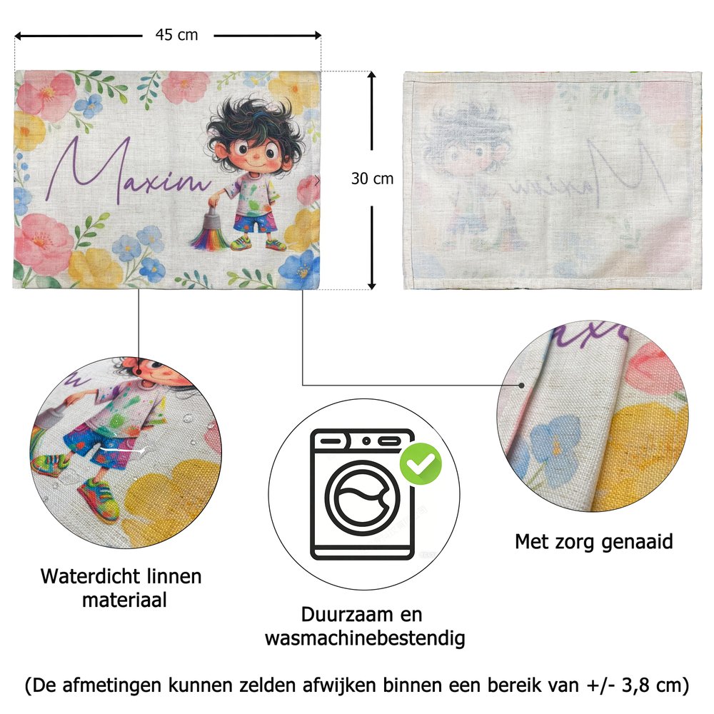 Gepersonaliseerd Linnen Placemat met Bloemen en Cartoonfiguur en Naam Ideaal voor Dagelijks Gebruik of Verjaardagscadeau voor Kinderen en Familie