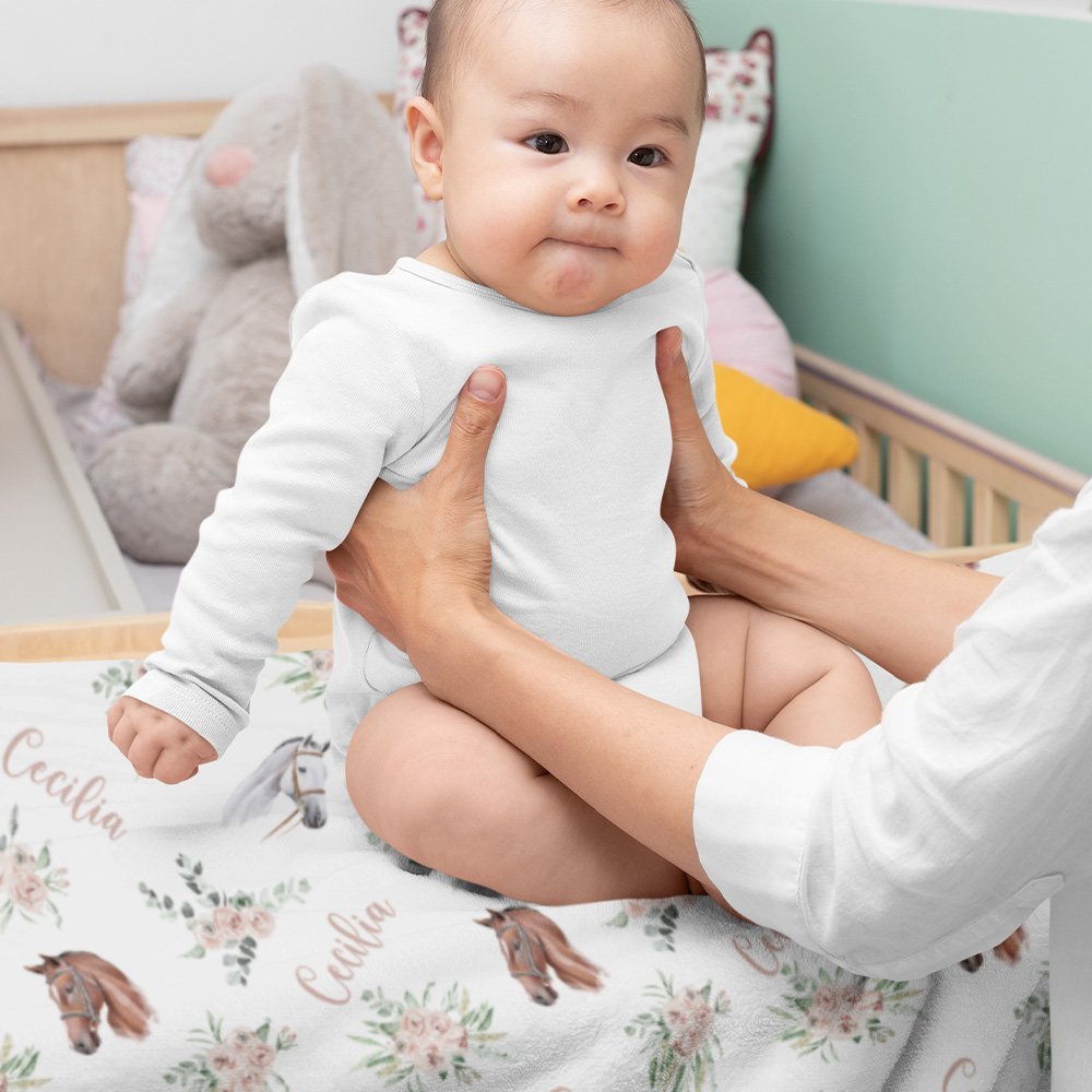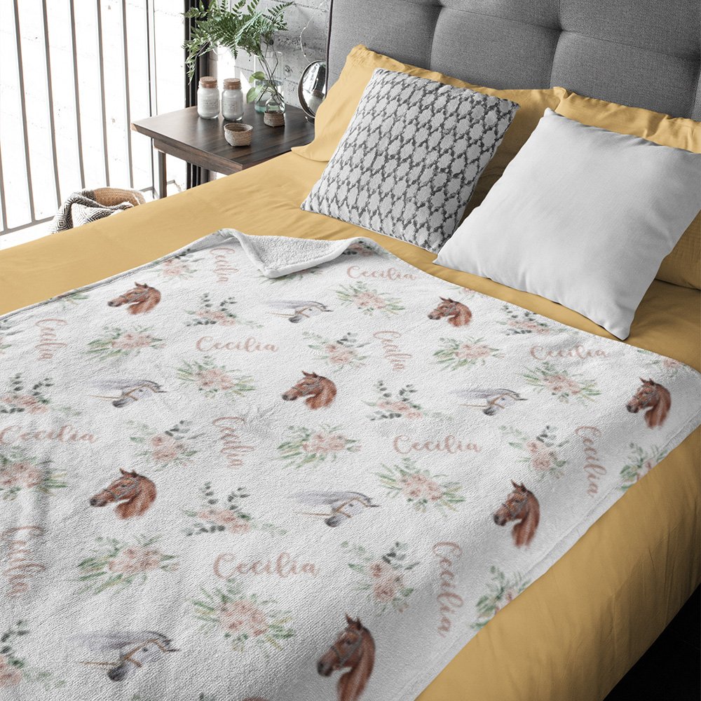 Deze deken heeft prachtige bloemen- en paardenpatronen, waardoor elke deken een uniek kunstwerk wordt. De namen rondom de deken voegen niet alleen een gevoel van kunst toe, maar benadrukken ook de exclusieve aangepaste kenmerken van de deken.