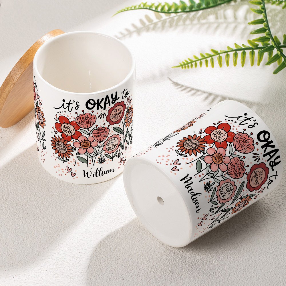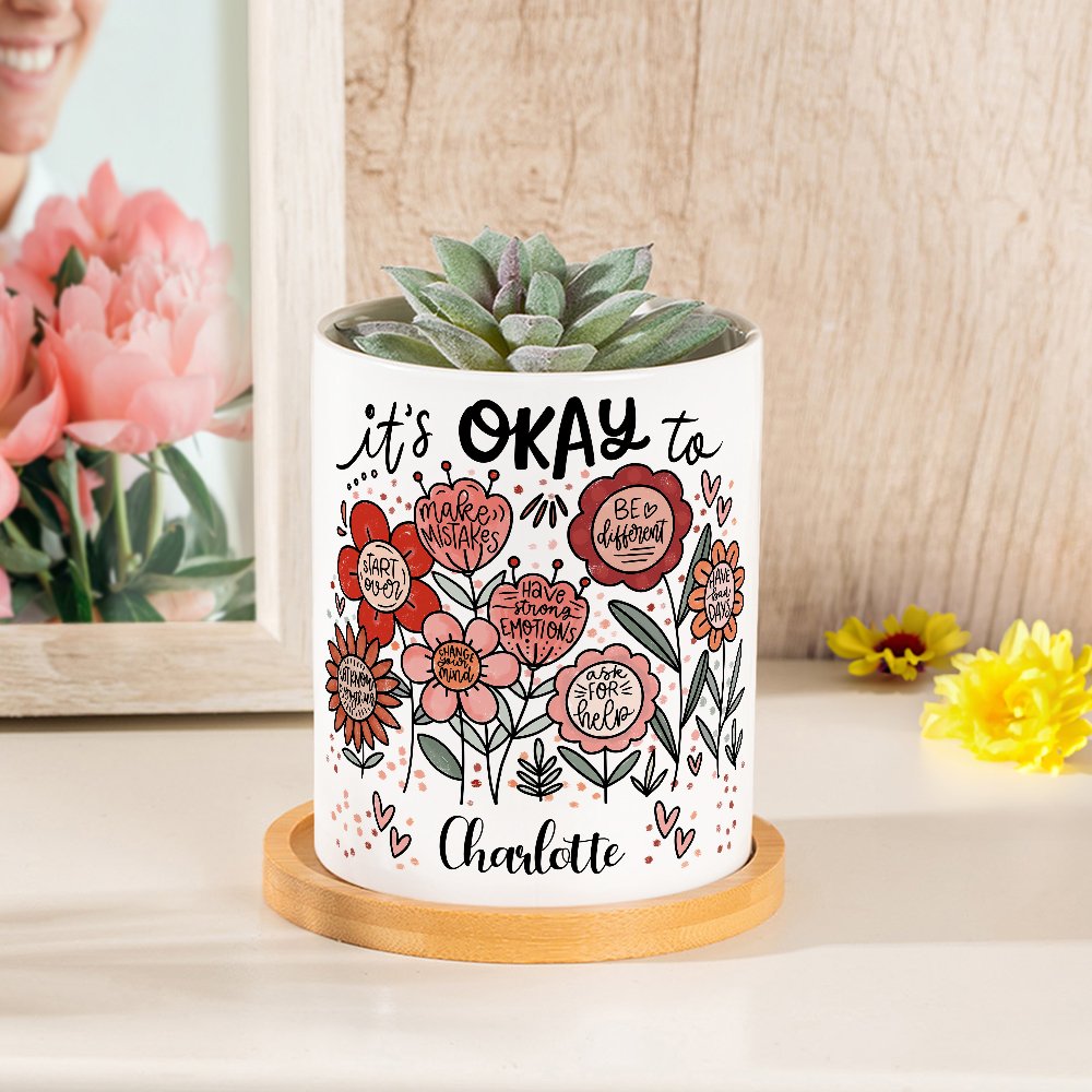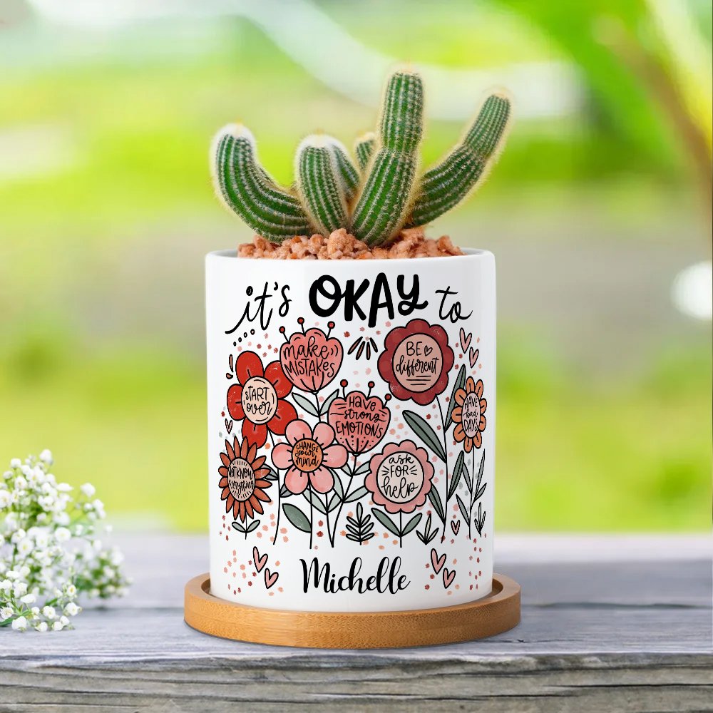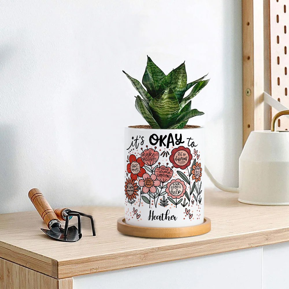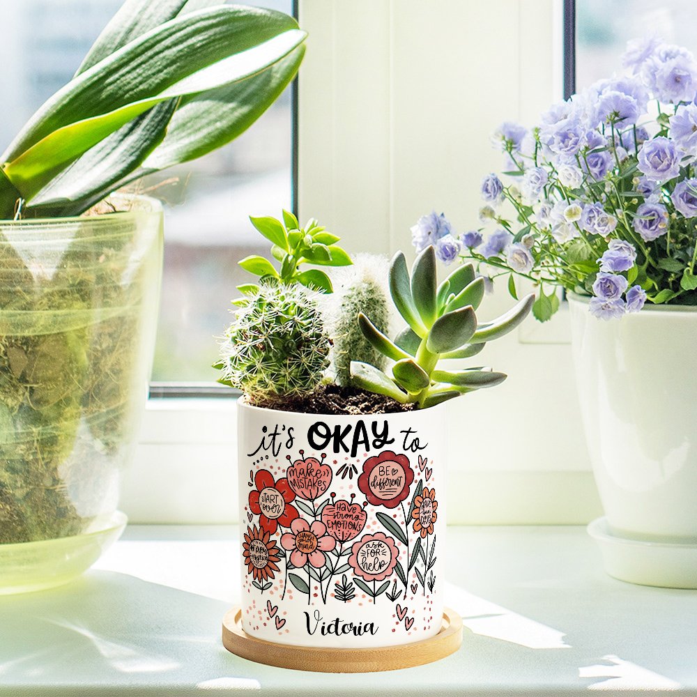 Gepersonaliseerde Bloem It Is Okay to Be Different Naam Keramische Plant Pot met Bamboe Base Verjaardag Positief Inspirerend Geschenk voor Familie Vriend