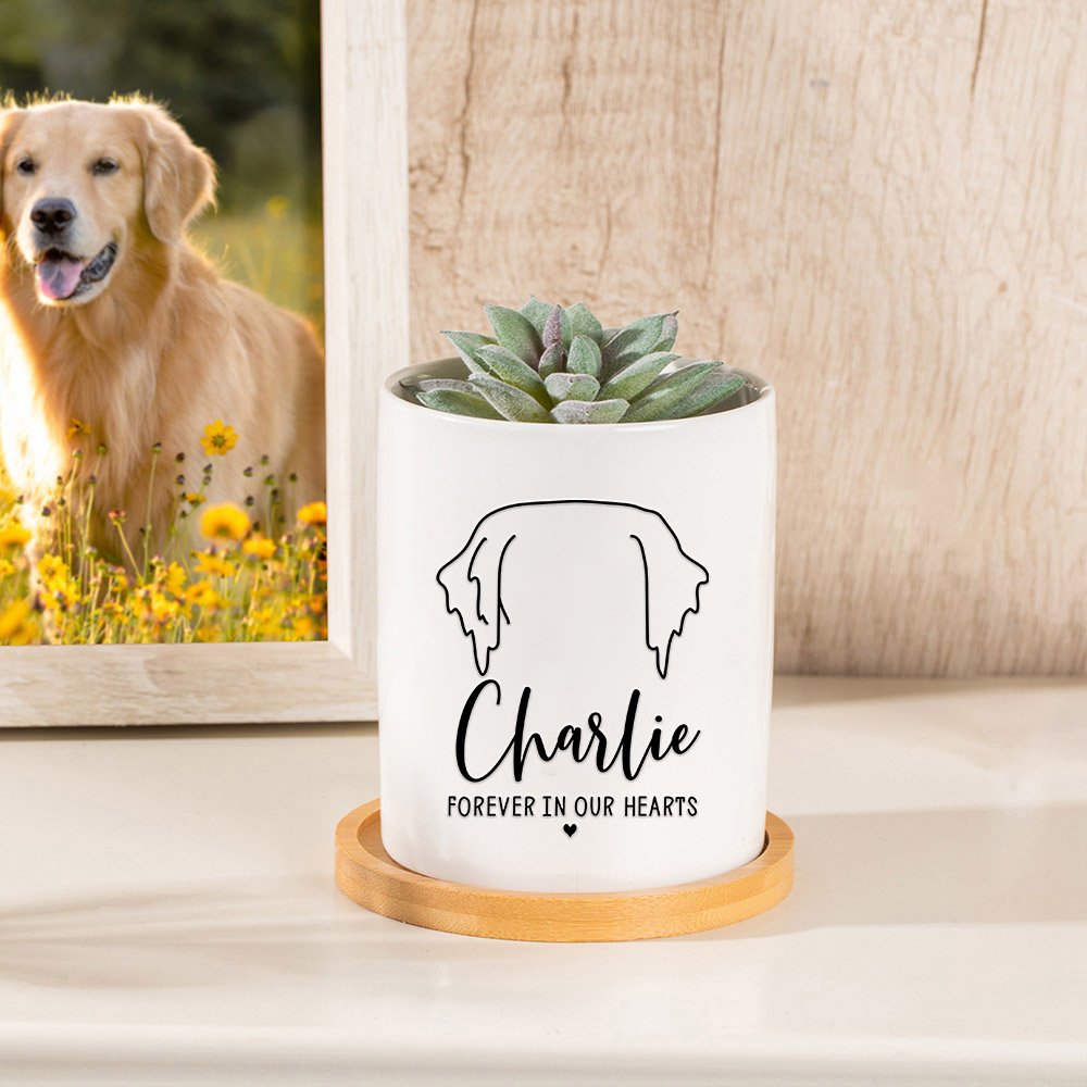 Dit buitengewone stuk is een oprecht eerbetoon dat de delicate aard van een keramische plantenbak prachtig combineert met de grillige charme van een op honden geïnspireerd ontwerp. Versierd met het onmiskenbare silhouet van hondenoren en de woorden "Forever in Our Hearts", is deze bloempot een aangrijpende herinnering aan de onvoorwaardelijke liefde en vreugde die je dierbare huisdier in je leven bracht.
