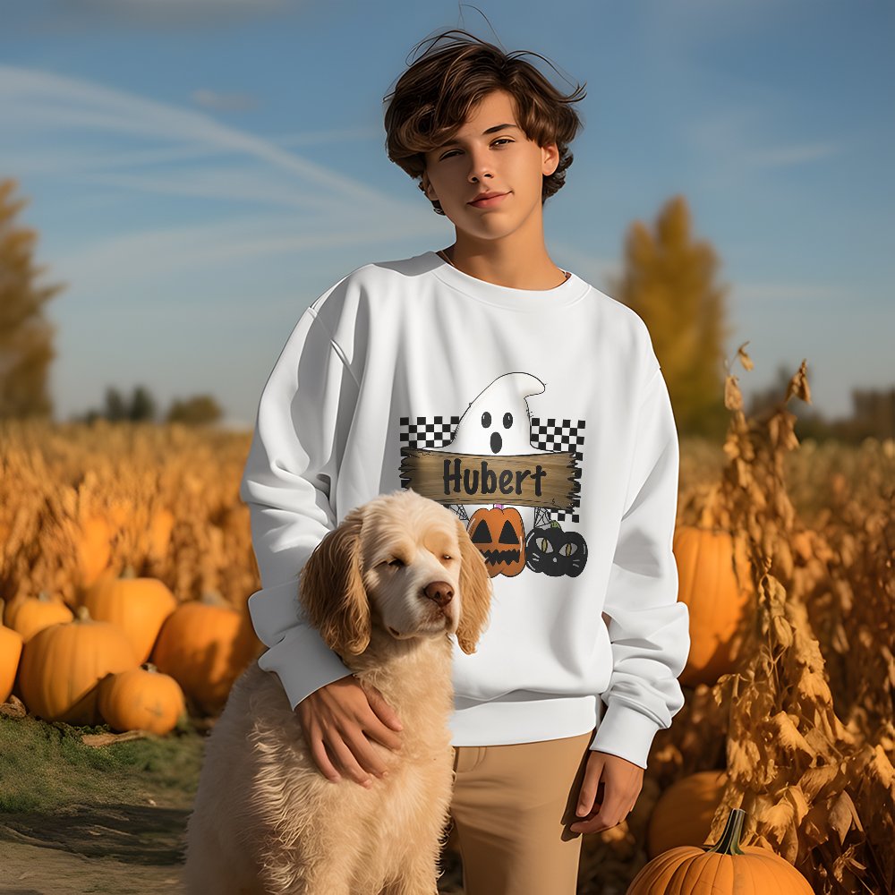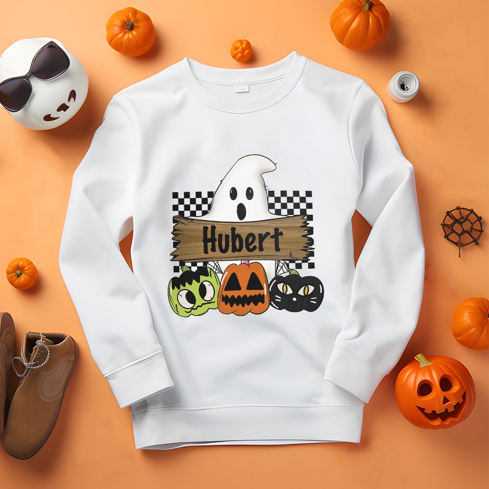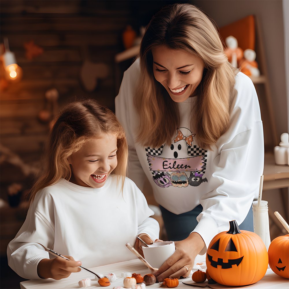 Op het sweatshirt staat een schattig griezelig spookje dat een mysterieus bord vasthoudt met een pompoen in de vorm van een vleermuis of zwarte kat. Dit symboliseert een moeder die haar kinderen door het Halloween-seizoen leidt en een bord draagt alsof ze slogans schreeuwt voor jouw vreugdevolle vieringen. Om je kostuum nog specialer te maken, heb je de optie om het te personaliseren met je naam of familienaam. Dit voegt een uniek tintje toe en maakt je kostuum echt uniek. Of je het nu viert op een familiebijeenkomst, een feestje of met vrienden, met onze gepersonaliseerde Halloween kostuums zit je altijd goed.