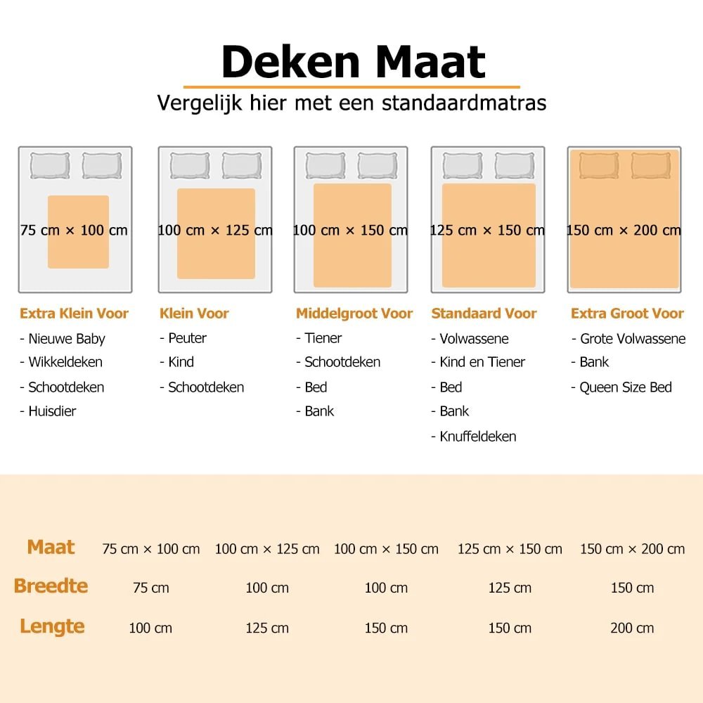 | Afmeting: | Sherpa Deken: 100 cm × 125 cm, 125 cm × 150 cm, 150 cm × 200 cm, Inbakerdoek: 29 cm × 53 cm, Knoopmuts: 16 cm × 33 cm, Fleece Deken: 75 cm × 100 cm, 100 cm × 125 cm, 100 cm × 150 cm, 125 cm × 150 cm, 150 cm × 200 cm |