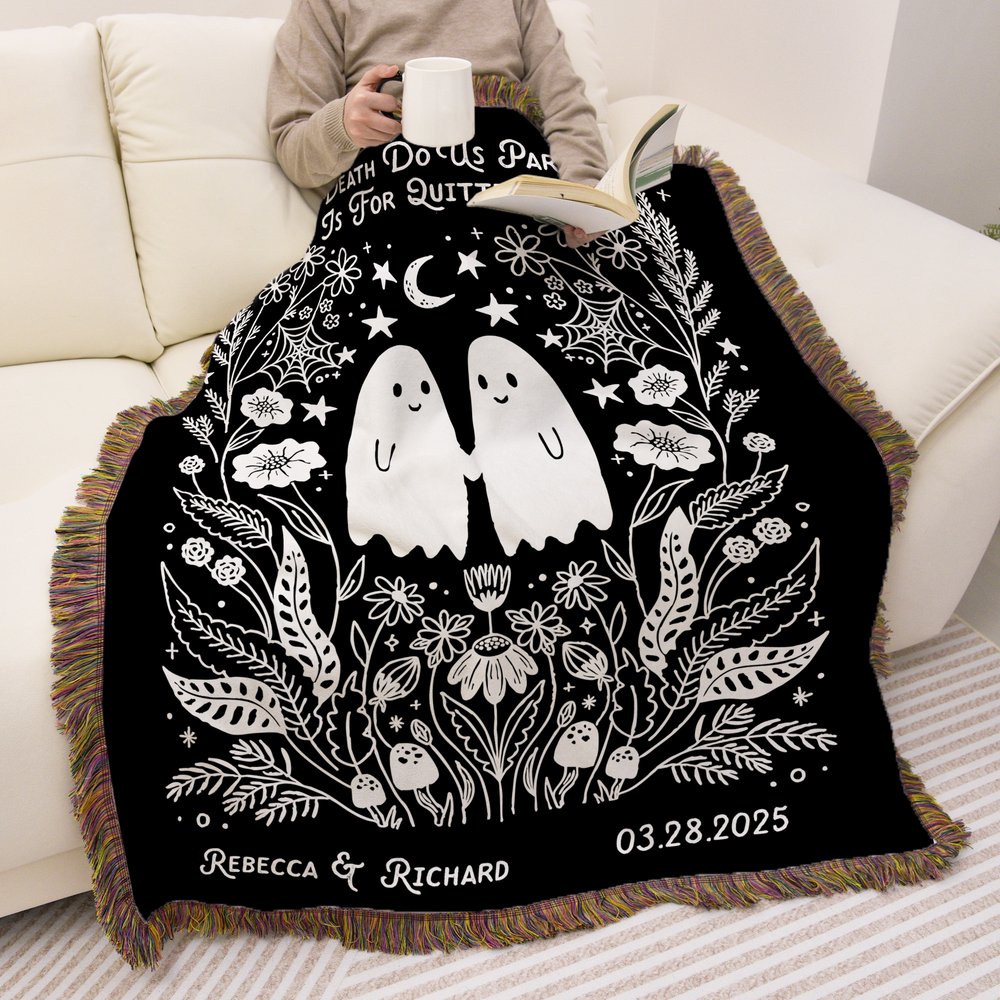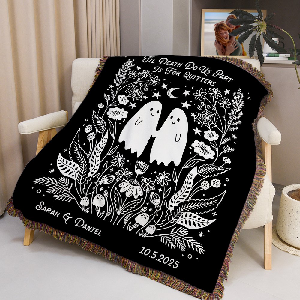 Gemaakt van zwart geweven stof met fijne franje details, heeft deze deken twee schattige spookmotieven omringd door bloemen, sterren, manen en spinnenwebben. De speelse zin "Til Death Do Us Part Is For Quitters" voegt een vleugje donkere humor toe, terwijl de optie om te personaliseren met de namen van het koppel en een speciale datum onderaan een betekenisvol aandenken creëert. De unieke mix van gothic, kawaii en Halloween-esthetiek zorgt voor een onderscheidend en persoonlijk decoratief statement.