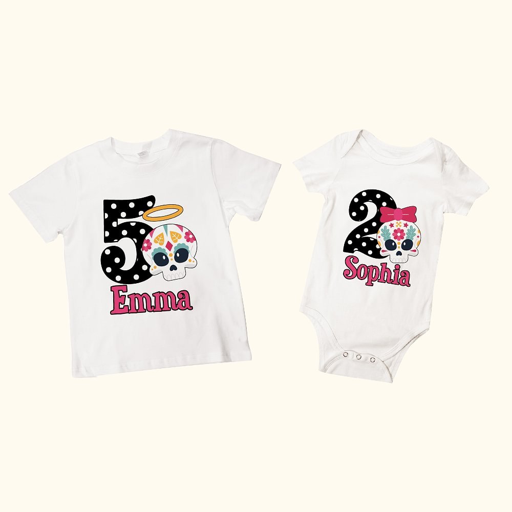 Dit gepersonaliseerde baby shirt heeft een opvallende Gothic sugar skull graphic, die een gedurfd en opvallend element toevoegt aan de garderobe van je kleintje. Je kunt het aanpassen met de naam en leeftijd van je kind voor een persoonlijk tintje.