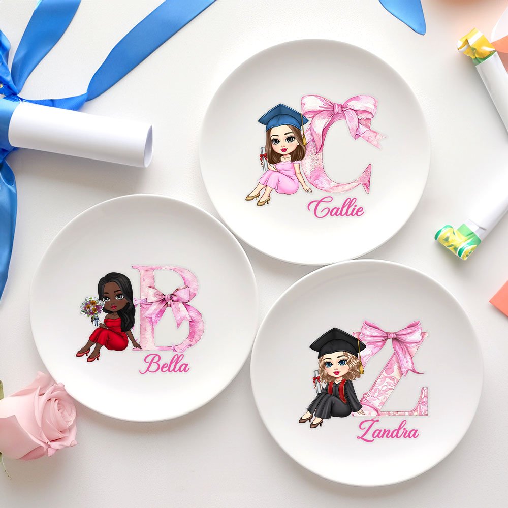 Deze sieradenschaal kan worden gepersonaliseerd met stripfiguren die afstuderen en combineert elementen van roze strikken en initialen, die elegant en lief zijn en perfect de stijl en prestaties van het afstuderende meisje laten zien. Je kunt de naam van de afgestudeerde aanpassen om een uniek en betekenisvol souvenir te maken om ze te feliciteren.