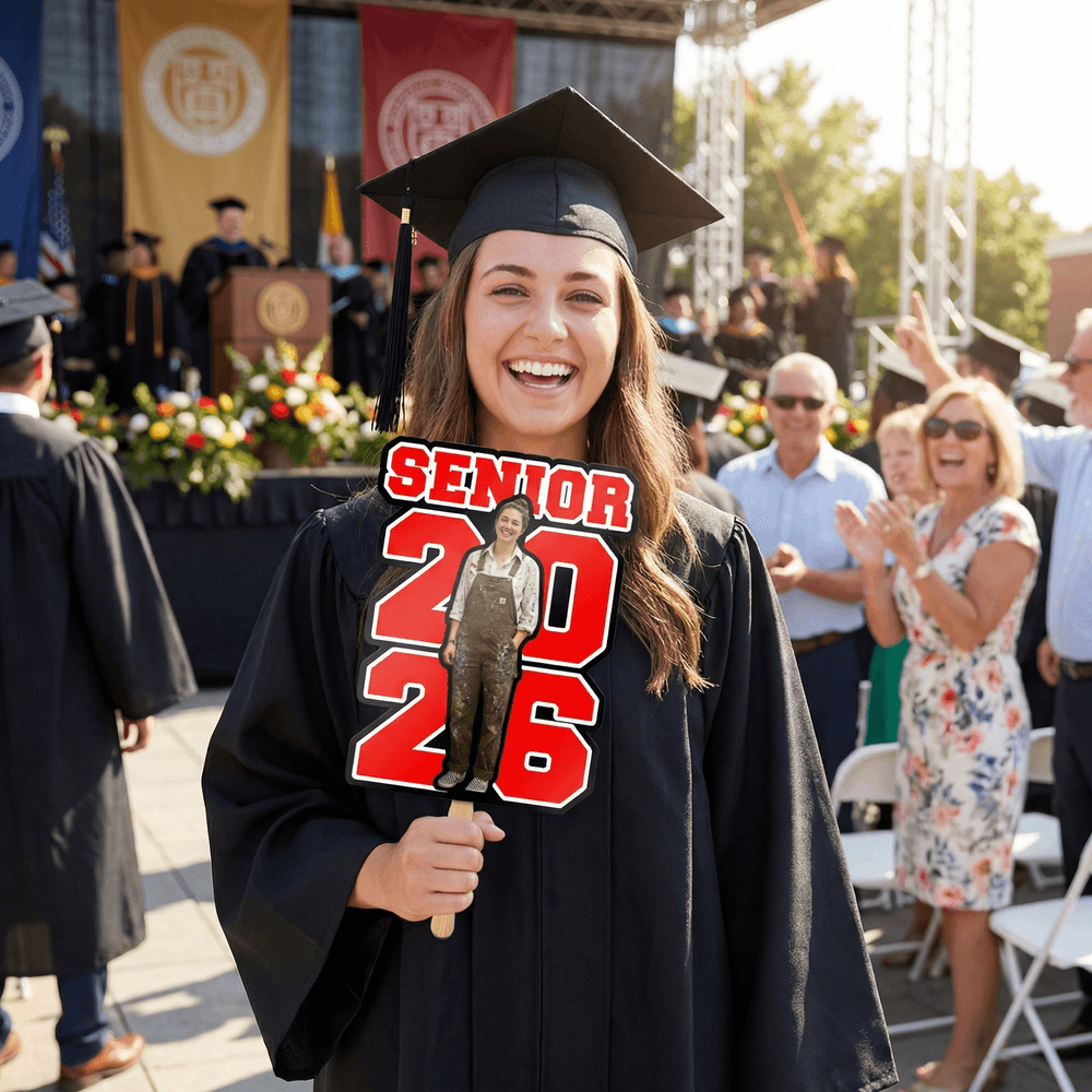 De waaier heeft een strak en elegant ontwerp dat perfect past bij de levendige sfeer van het afstudeerseizoen. De waaier kan worden aangepast met de volledige lichaamsfoto van de afgestudeerde en de tekst "SENIOR 2026", waardoor een unieke waaier voor het afstuderen ontstaat. Door het jeugdige beeld van de afgestudeerde van dit onvergetelijke moment te bewaren, wordt elke waaier een speciaal aandenken dat hun reis en prestaties viert.