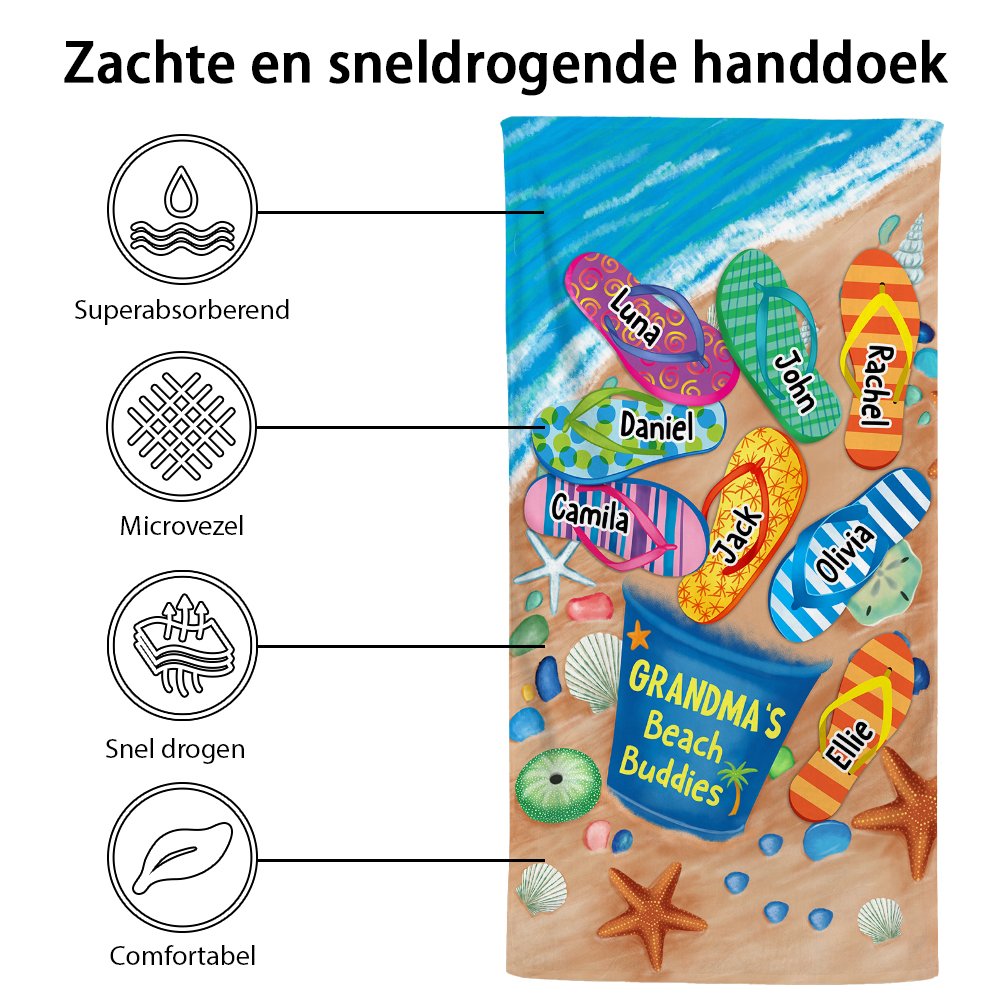 Dit prachtige strandlaken heeft een optie om namen op slippers te personaliseren. U kunt tot 1-8 namen en slippers toevoegen om het cadeau nog persoonlijker te maken. Het is een heerlijke manier om de familiebanden te vieren en zal ontegensprekelijk een leuk element toevoegen aan elke stranddag.