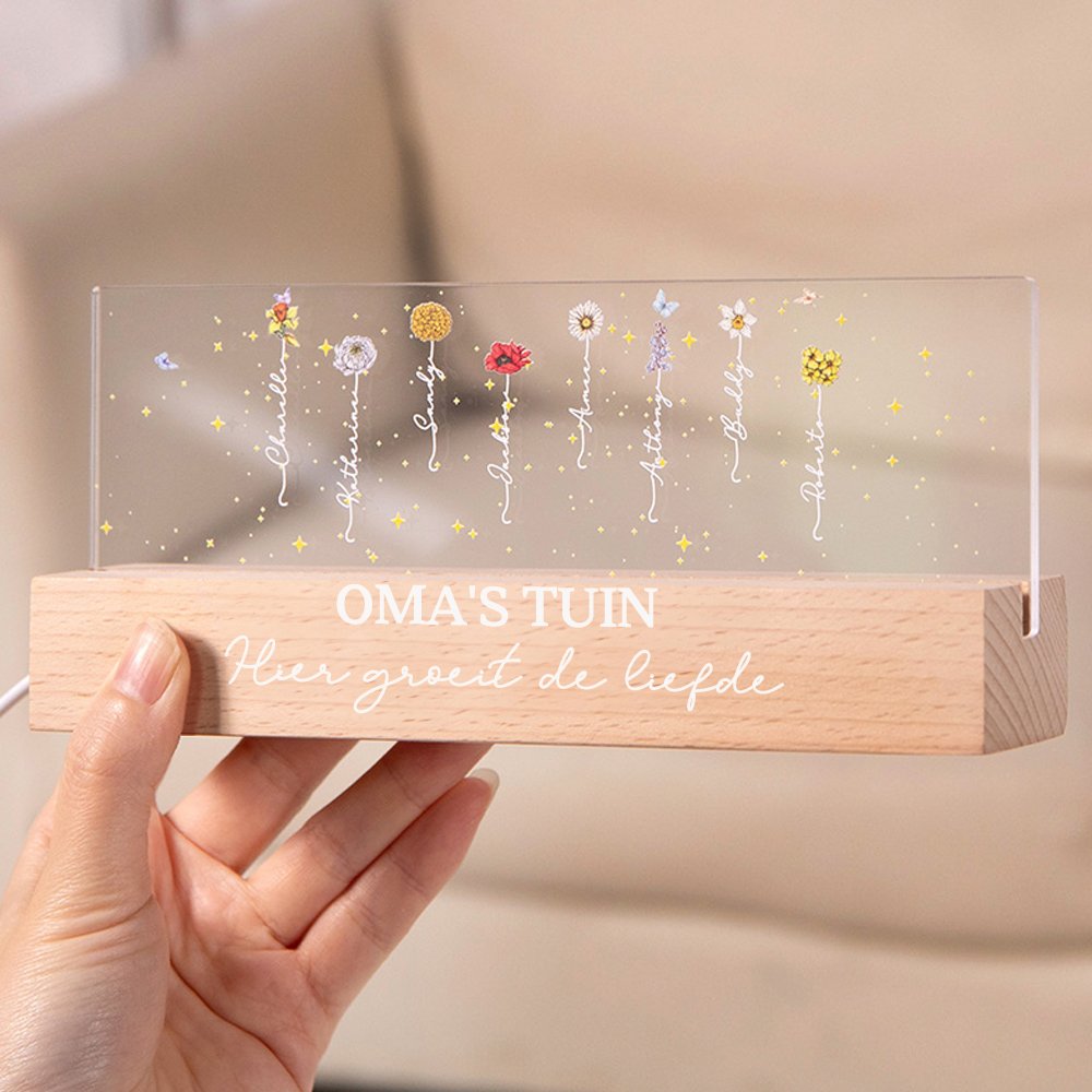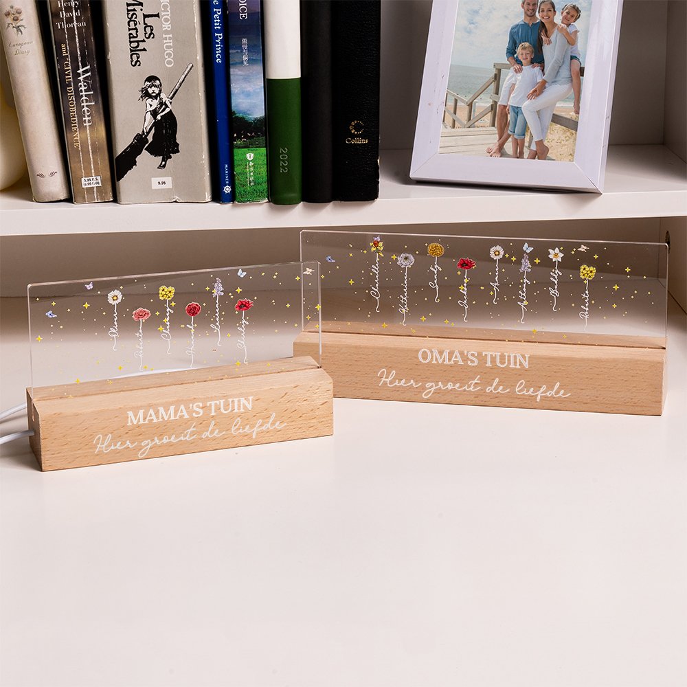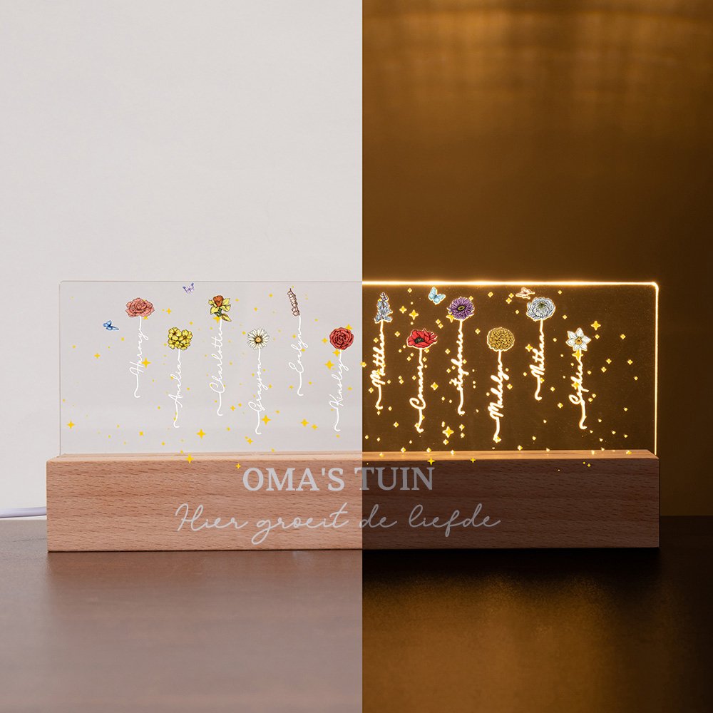 Elke Geboortebloem vertegenwoordigt een familielid, waardoor een lichtgevende stamboom ontstaat die warmte en liefde uitstraalt. Je kunt kiezen uit 12 soorten verjaardagsbloemen. LED-lampjes verlichten zachtjes de ingewikkelde bloemmotieven en creëren een zachte, rustgevende sfeer in elke kamer. Het is niet zomaar een lichtje; dit is een warm eerbetoon aan familiebanden en gekoesterde herinneringen.