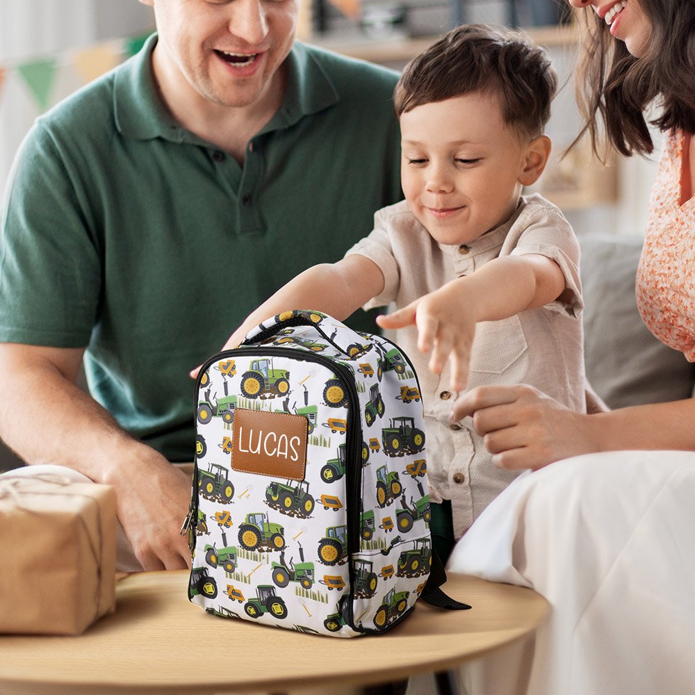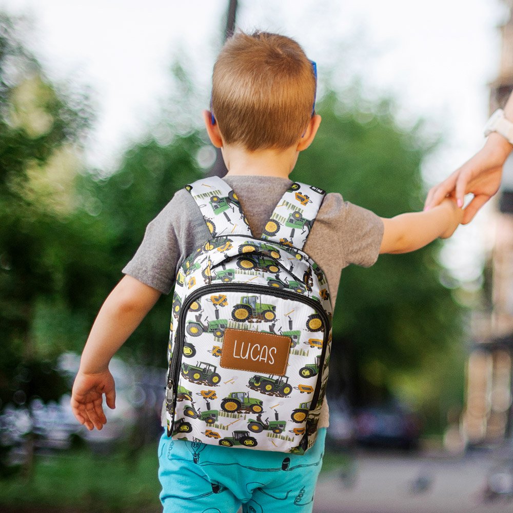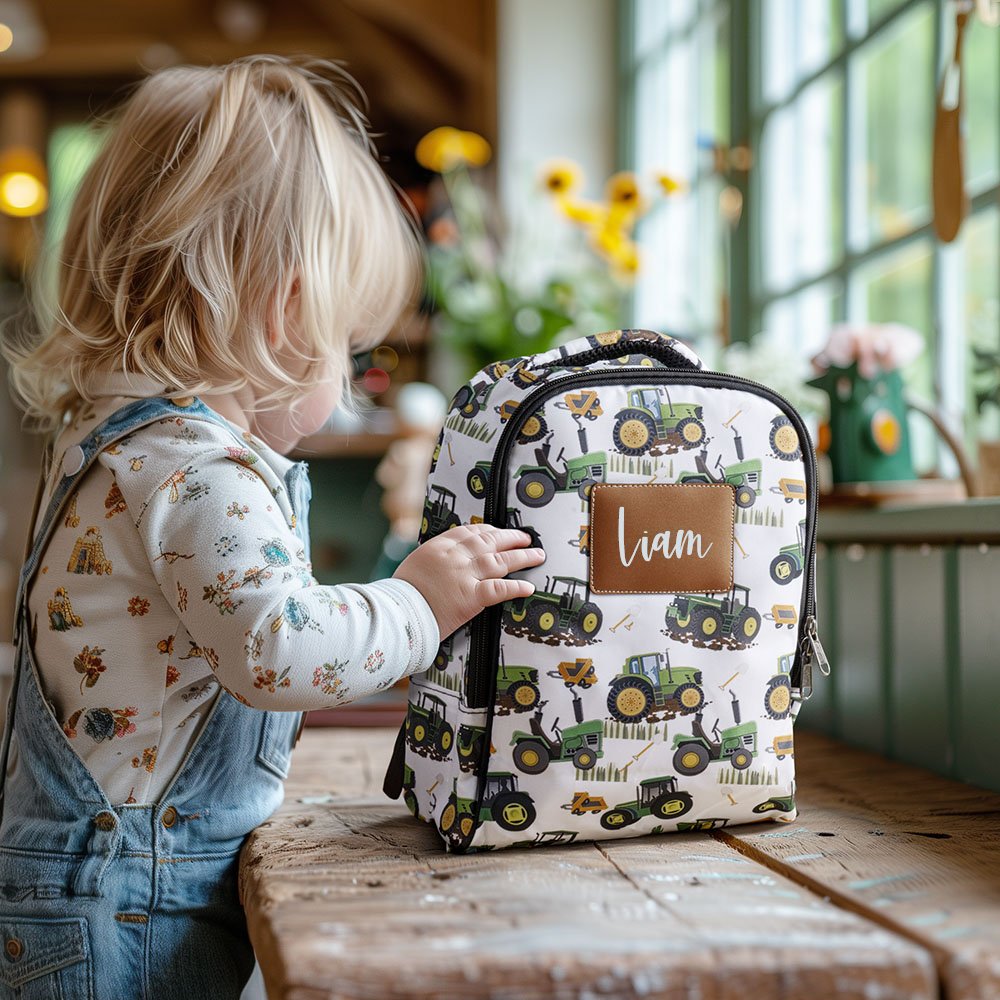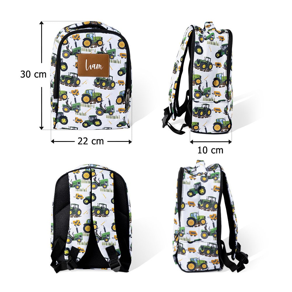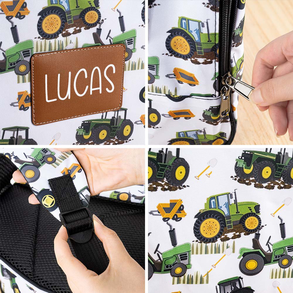 Deze kleine rugzak is ontworpen met interessante patronen, zoals verschillende bouwvoertuigen in cartoonstijl. Het ontwerp is speels en trekt de aandacht van kinderen. De tas wordt geleverd met een leren label dat kan worden aangepast met de naam van het kind, zodat de eigenaar eenvoudig te herkennen is.