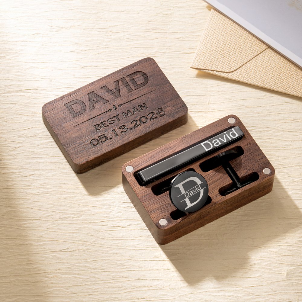 Of het nu gaat om manchetknopen, pakclips of houten kistjes, we maken er een persoonlijk en aangepast ontwerp van waarbij je ervoor kunt kiezen om het te voorzien van je eigen naam of die van de ander, een datum of een speciale boodschap, waardoor het een exclusief accessoire wordt dat een dierbaar aandenken zal blijven ondanks het verstrijken van de tijd.