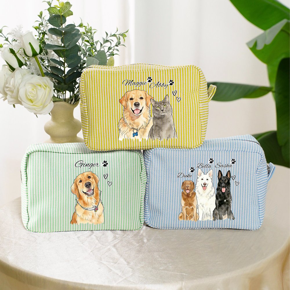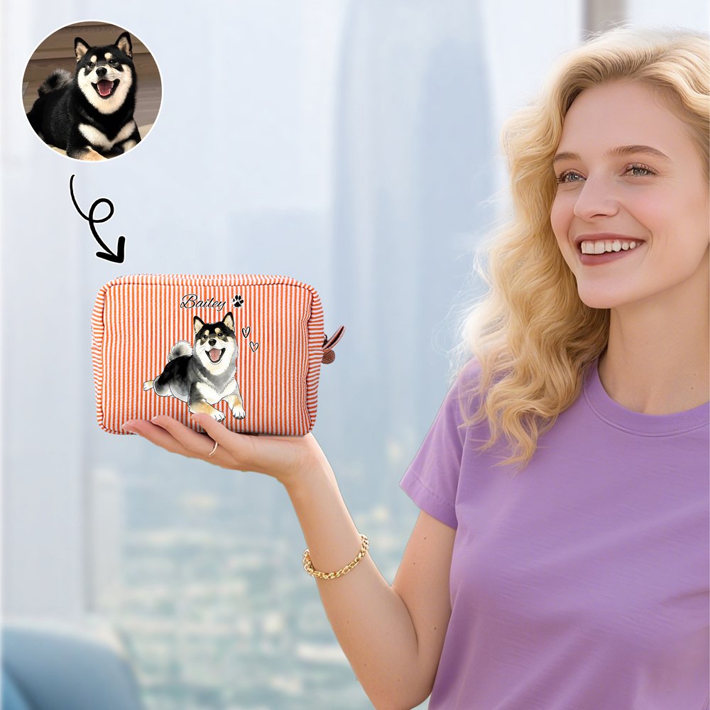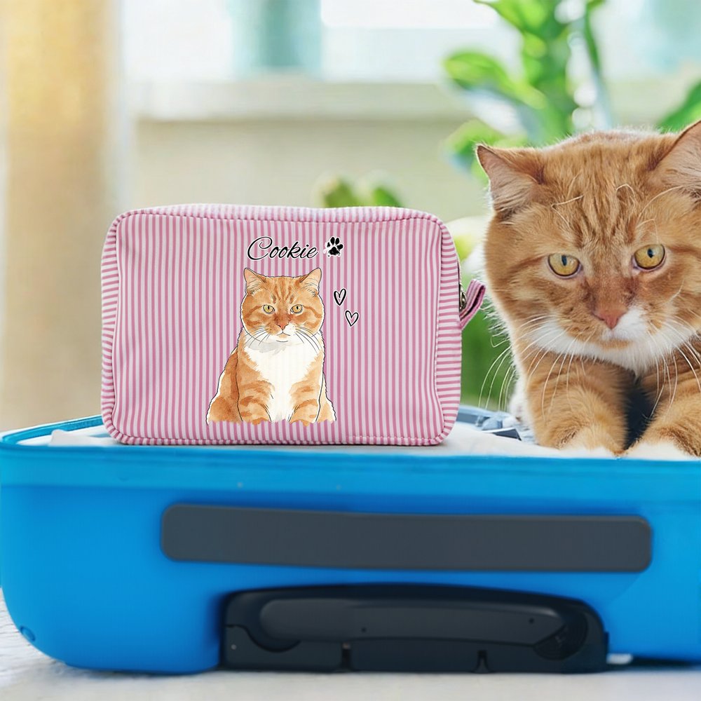 Deze make-uptas is voorzien van een delicaat, handgeschilderd dierenportret in aquarelstijl, dat kan worden aangepast met de afbeelding van een geliefd huisdier en een persoonlijke naam. De kleurrijke verticaal gestreepte achtergrond en de schattige huisdierillustratie creëren een artistiek contrast, waardoor elk detail een unieke verlenging van de genegenheid van de eigenaar is. Het combineert praktische functionaliteit met individuele expressie.