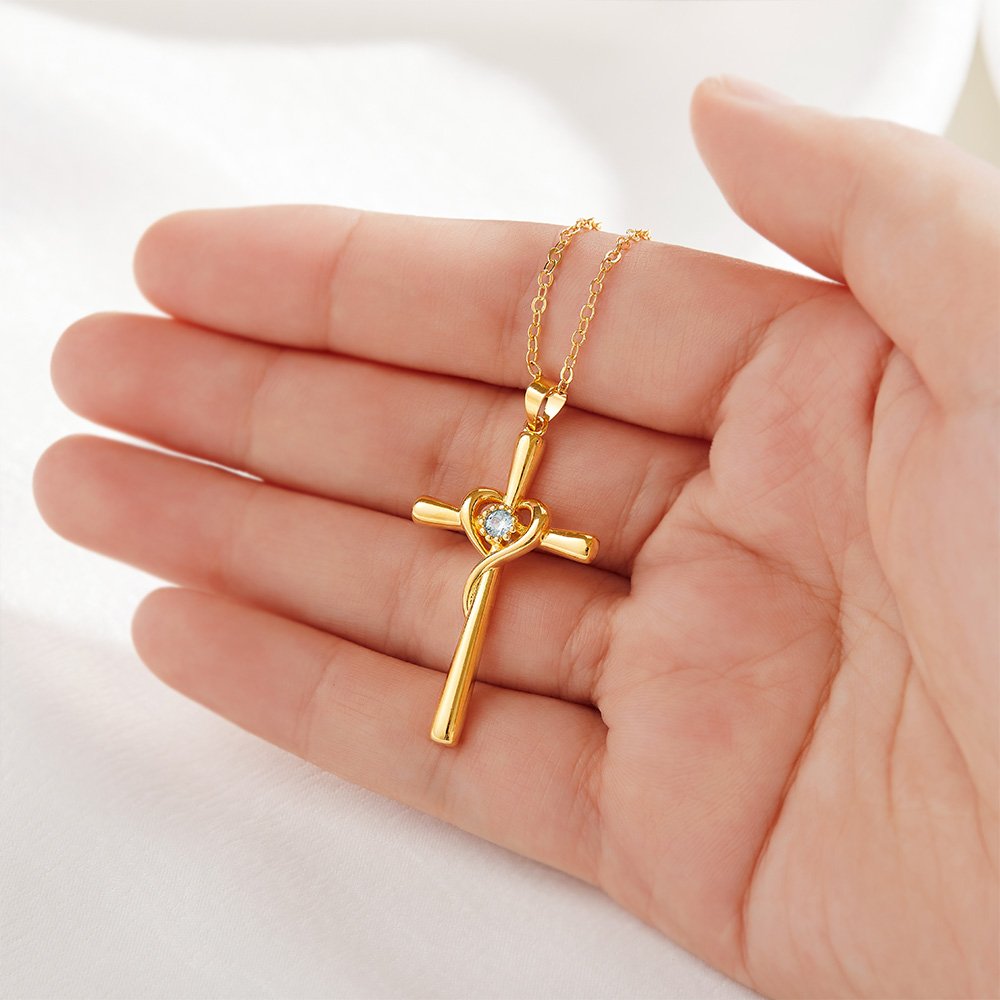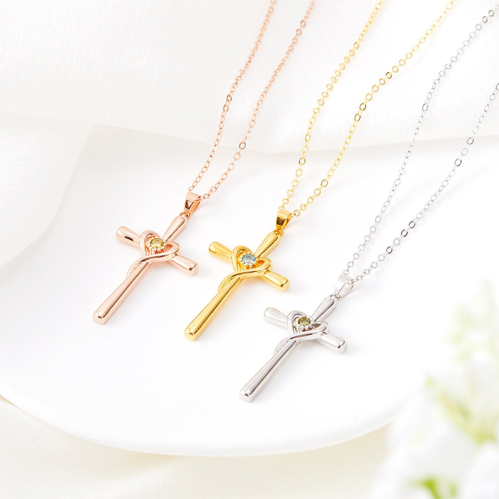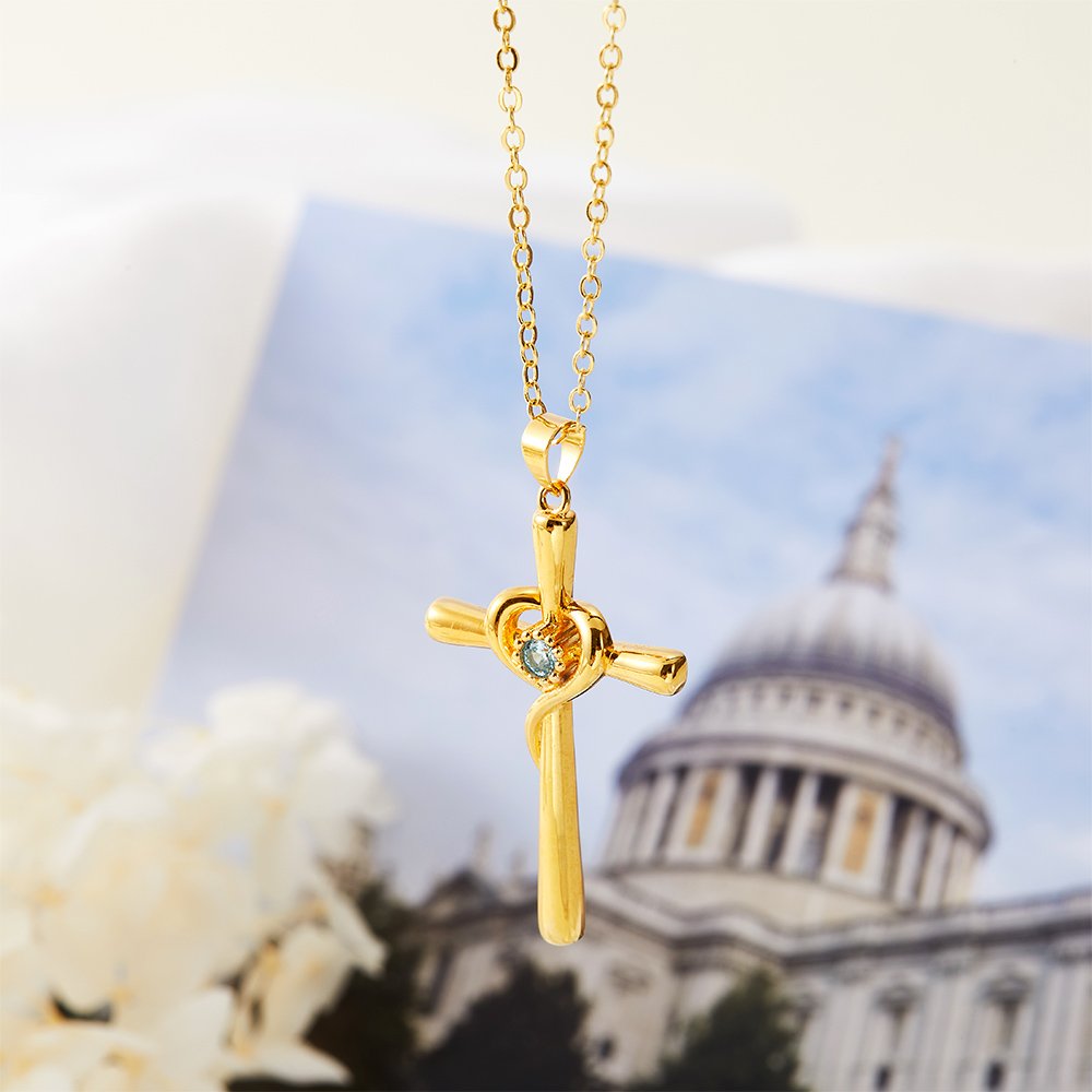 Deze ketting combineert de elementen van een hart en een kruis. Het liefdeshart is rond het kruis gewikkeld, wat liefde en geloof symboliseert, en in het midden is een geboortesteen ingelegd, wat een prachtig effect geeft. Je kunt de geboortesteen vrij kiezen om deze ketting te personaliseren, zodat hij staat voor de maand waarin je geliefde is geboren.