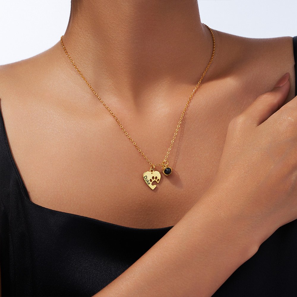 Deze ketting is geïnspireerd op de diepe genegenheid tussen mensen en huisdieren. Het unieke ontwerp van liefde en holle pootafdrukken symboliseren de warme voetafdrukken die huisdieren in ons hart achterlaten. Er is ook een microprojectie stenen hanger aan de zijkant, die de foto van het huisdier en de omringende tekst (zoals Ik hou van je in honderd talen) kan weergeven wanneer bekeken via een smartphone of een speciale lens, zodat je hun herinneringen overal met je mee kunt dragen.