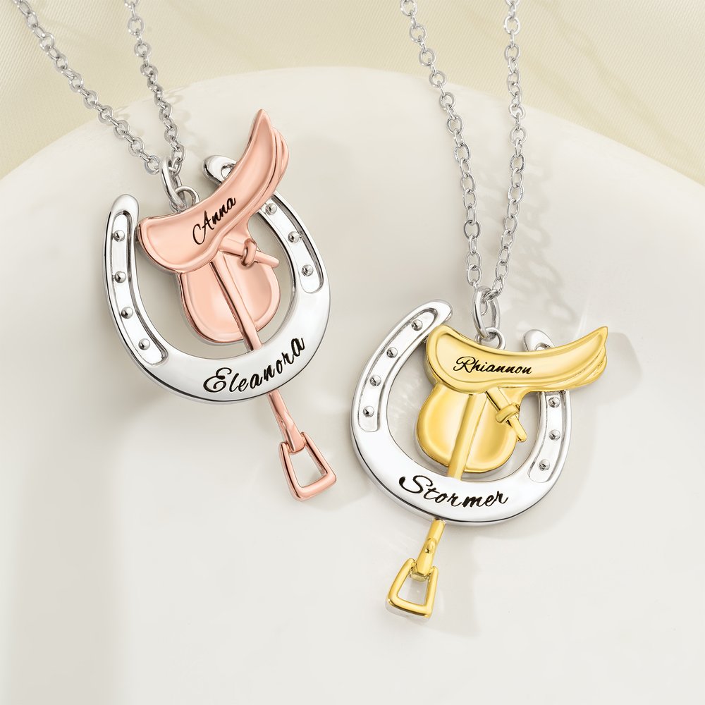 Deze ketting is gecentreerd rond een frame van een hoefijzer, waarin op een slimme manier een zadel is verwerkt. Het hoefijzer symboliseert bescherming en geluk, terwijl het zadel de band tussen ruiter en paard symboliseert. De ketting kan worden gegraveerd met de namen van zowel paard als eigenaar, waardoor elk stuk een uniek eerbetoon aan een persoonlijk verhaal wordt.