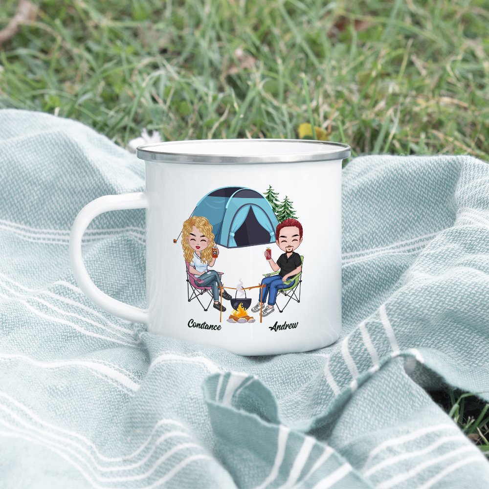 The design of these mugs is both stylish and practical. The classic enamel finish gives them a traditional camping look while the personalized couple characters add a special touch. The design is also durable, making these mugs perfect for any camping trip.