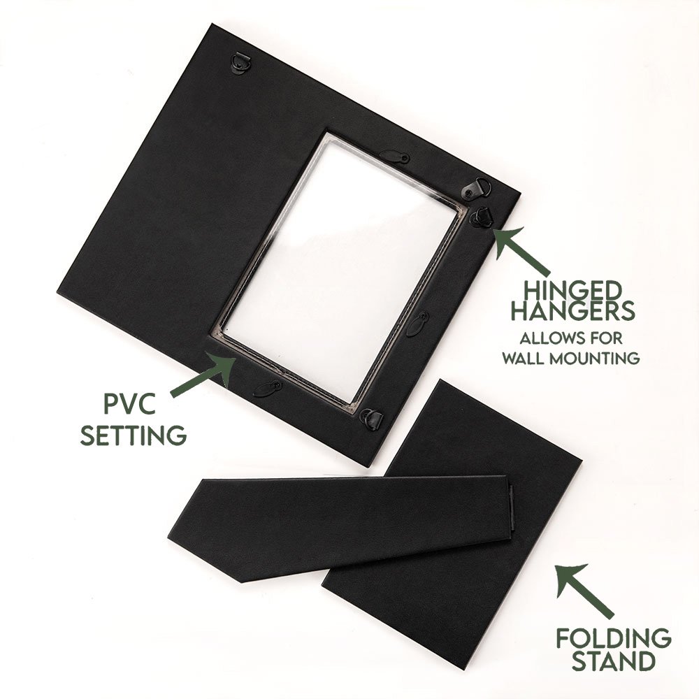 De fotolijst is gemaakt van veganistisch leer, hoogwaardig verfijnd hout en PVC, dat niet alleen duurzaam is maar ook een elegante uitstraling heeft. Het paar zal zich comfortabel voelen met de bedrukte matte afwerking. Het frame past precies op je nachtkastje omdat het de ideale maat heeft.