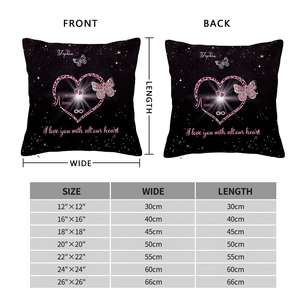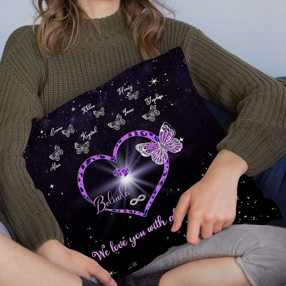 De kussenhoes met hartvlinder heeft een enorm hartontwerp van een moeder- of omavlinder, samen met 1-9 kleine vlinders die kunnen worden aangepast met namen. Elke kleine vlinder staat voor elk kind of kleinkind. De quote "We houden van je met heel ons hart" laat je warme hart en oprechte liefde voor mama of oma zien.
