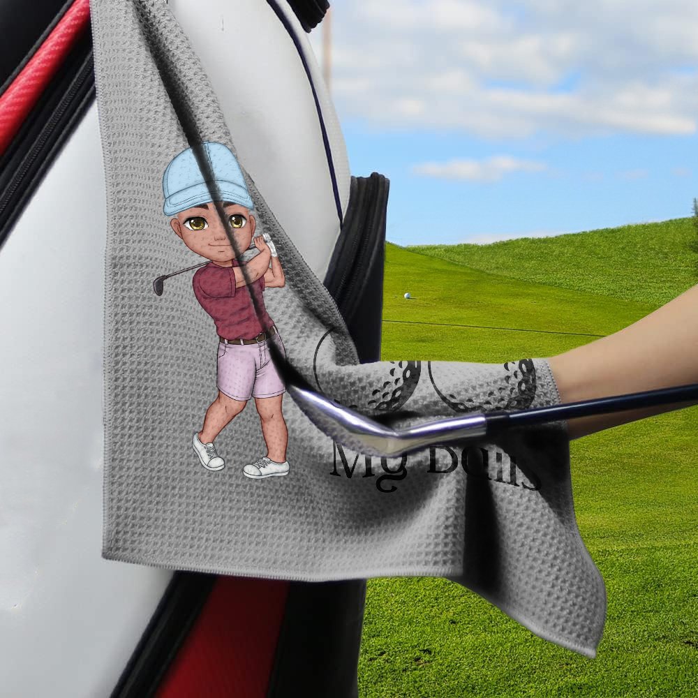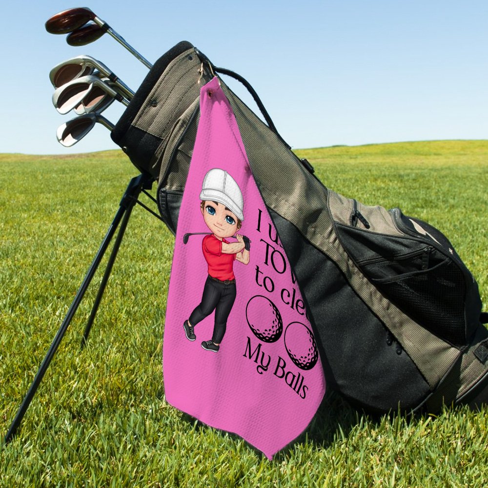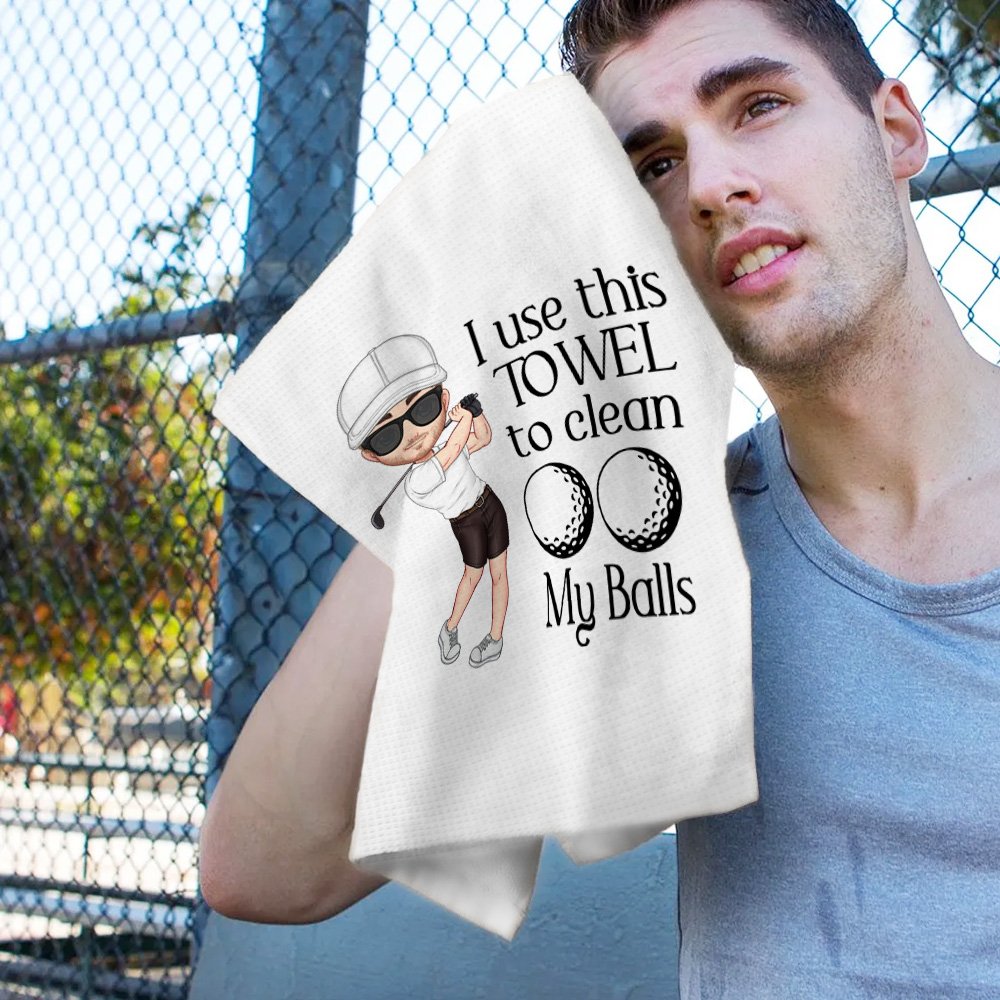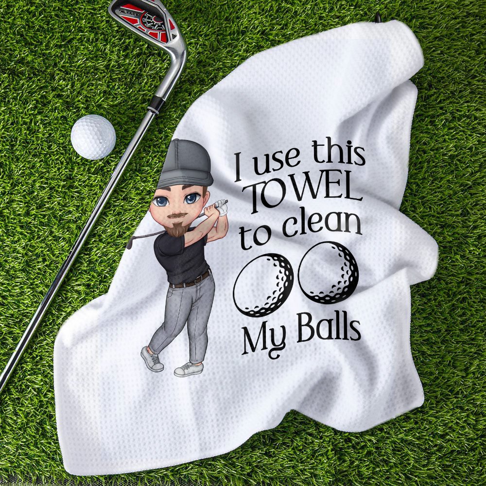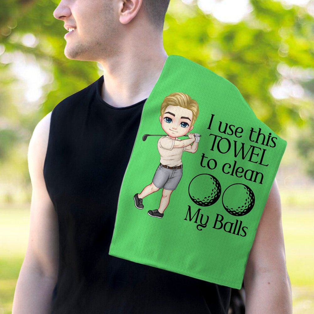Deze golfhanddoek is ontworpen met een gepersonaliseerd cartoonfiguurtje van een golfman, humoristisch en bijzonder. De speelse zin "I Use This Towel to Clean My Balls" drukt de persoonlijkheid en liefde van een golfer voor het spel uit, het is een perfecte accessoire voor je golfuitrusting.