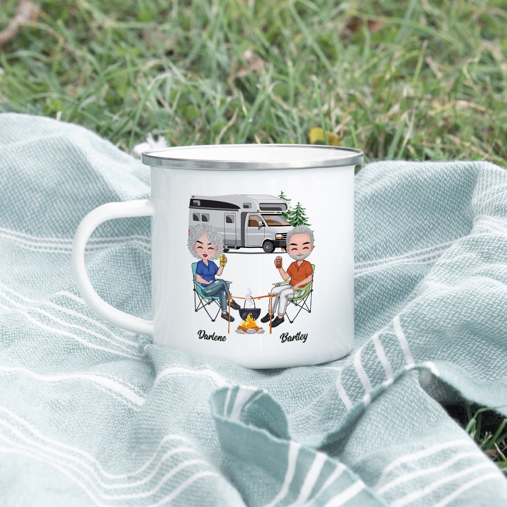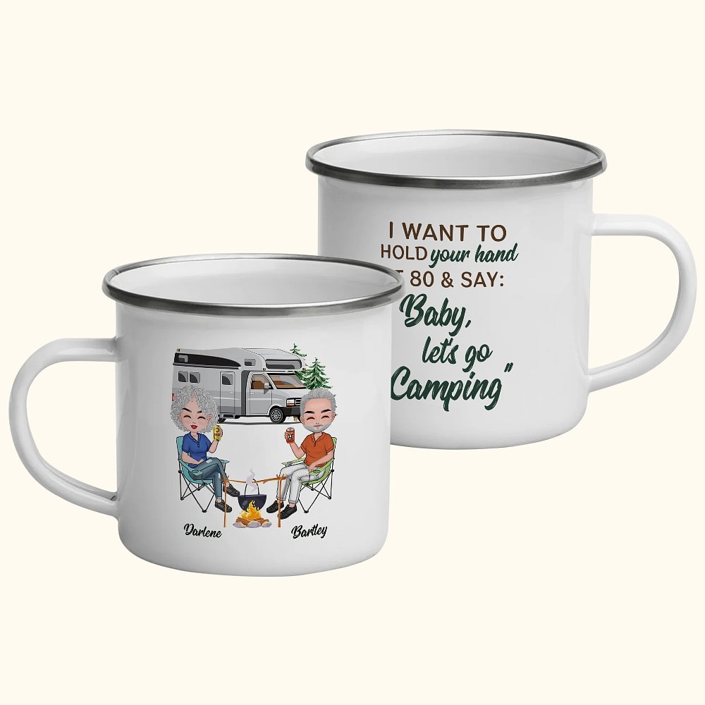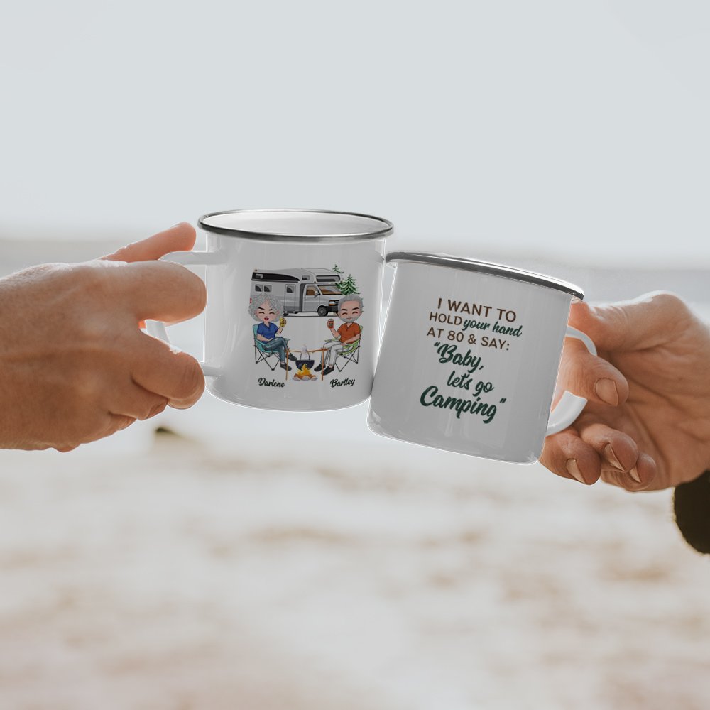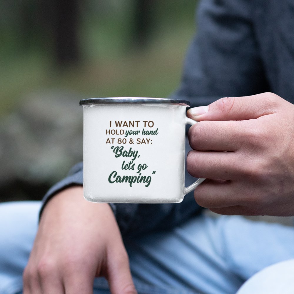 Are you an outdoor enthusiast? Do you love camping adventures with your special someone? If so, we have the perfect gift for you! Introducing Our "I Want to Hold Your Hand at 80 and Say Baby Let's Go Camping" enamel mug, designed specifically for camping-loving couples. This unique and thoughtful gift is the perfect way to show your love and appreciation for your partner while enjoying your favorite outdoor activities together.
