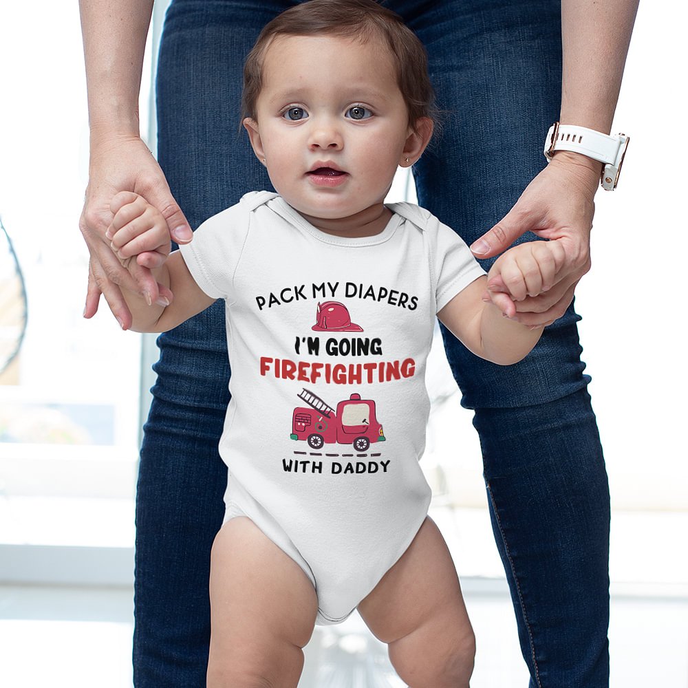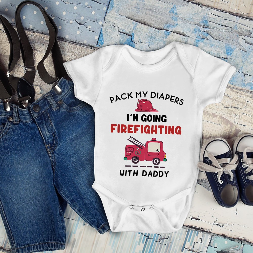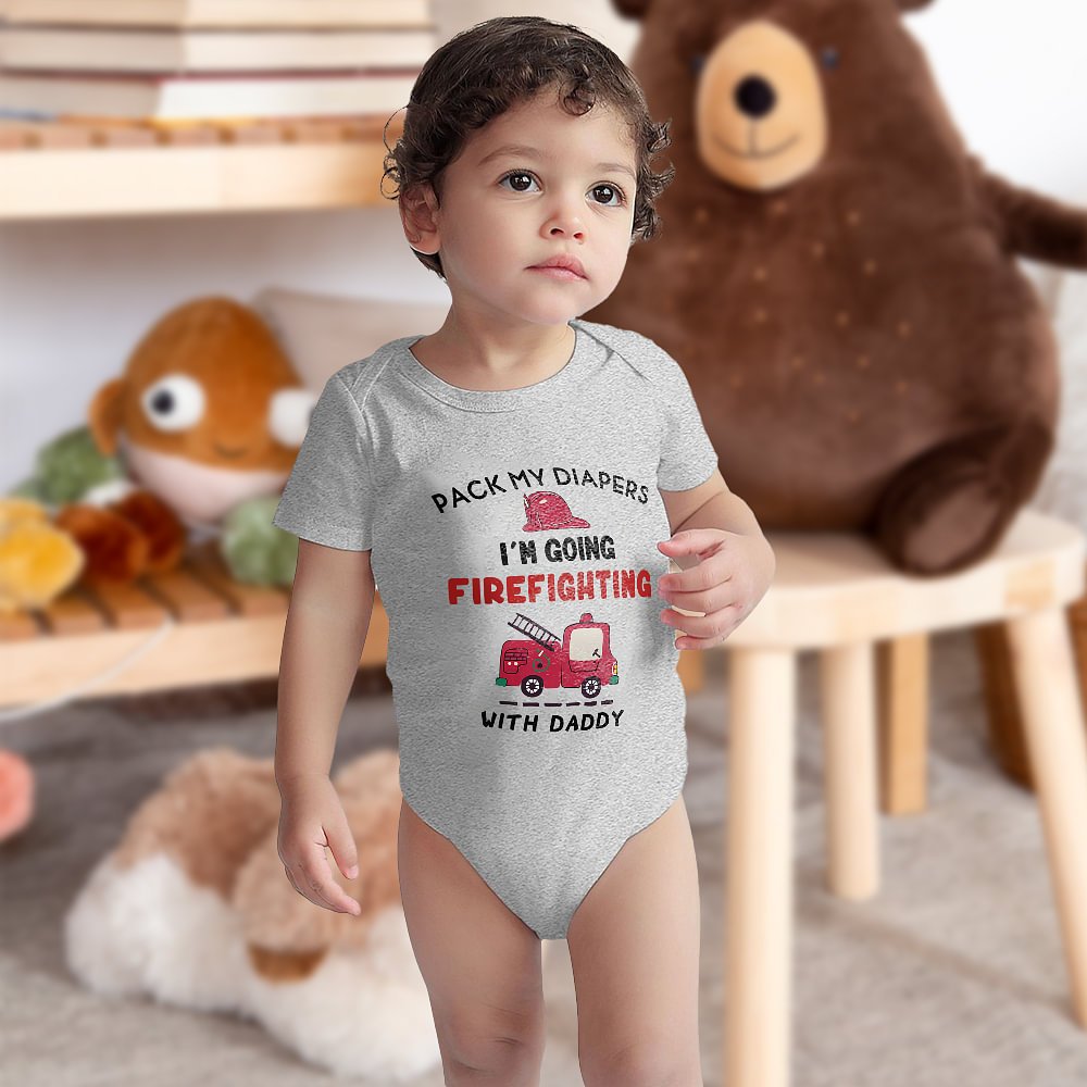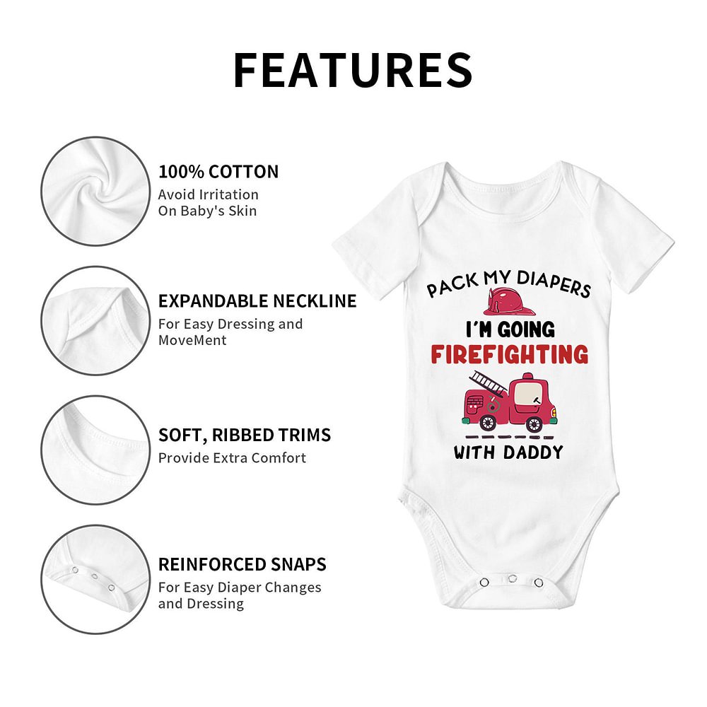 Dit schattige eendelige babypakje is bedrukt met de woorden "I'm Going Firefighting With Daddy" en het schattige brandweerwagenpatroon, dat de hechte band tussen vader en zoon symboliseert en de warme ouder-kind tijd laat zien. Andere teksten kunnen ook worden aangepast om het kledingstuk nog unieker te maken.