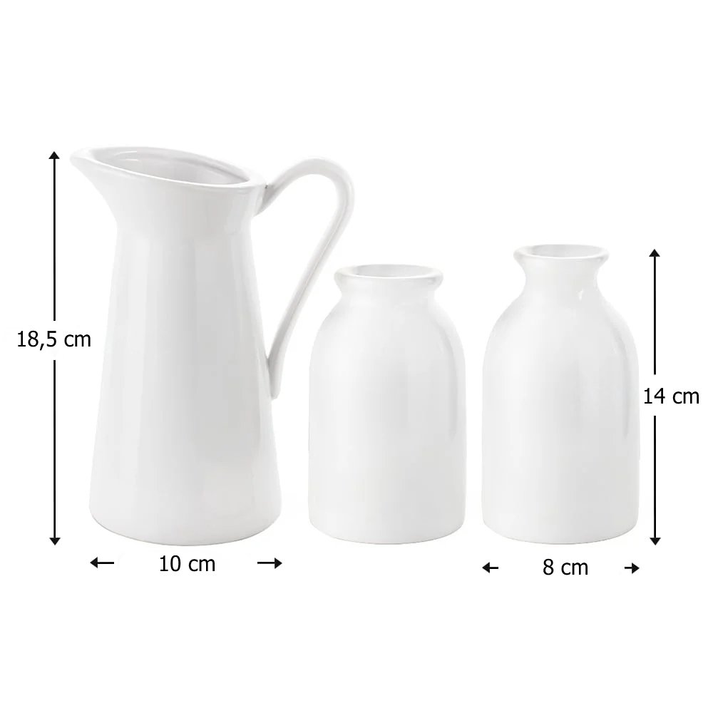 Afmetingen: Flesvormige vaas met smalle hals: 8 cm × 8 cm × 14 cm Flesvormige vaas met brede hals: 8 cm × 8 cm × 13,5 cm Kruikvaas met handvat: 14,7 cm × 10 cm × 18,5 cm