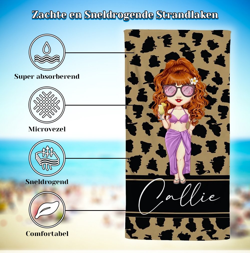 Dit strandlaken heeft een ontwerp van een vrouwelijk stripfiguur en een structuurontwerp dat een dierenvacht imiteert, wat zowel speels als wild is. U kunt ook uw naam op het strandlaken drukken om uw persoonlijkheid volledig tot zijn recht te laten komen.