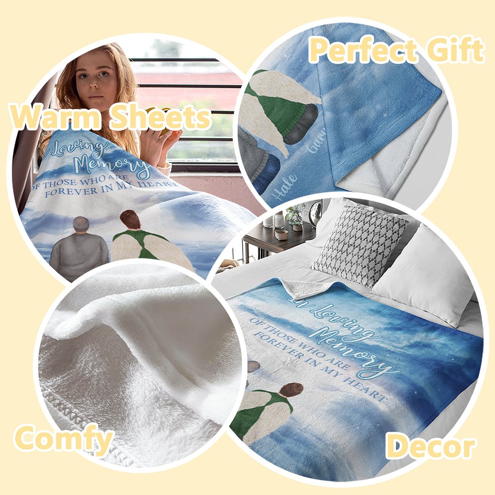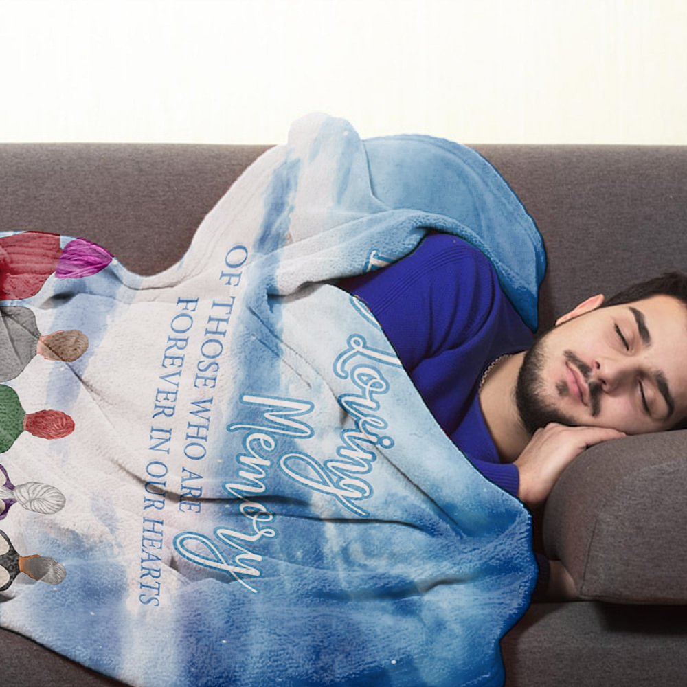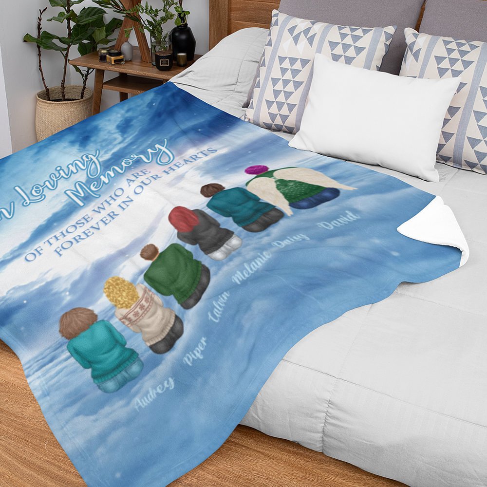 De boodschap "In Loving Memory Of Those Who Are Forever In My Heart/In Loving Memory Of Those Who Are Forever In Our Hearts" is prachtig afgedrukt op de deken en herinnert de mensen eraan om altijd te denken aan dierbaren die zijn overleden.