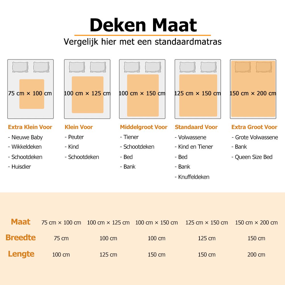 | Afmetingen: | Fleecedeken - 75 cm × 100 cm, 100 cm × 125 cm, 100 cm × 150 cm, 125 cm × 150 cm, 150 cm × 200 cm, sherpa deken: 100 cm × 125 cm, 125 cm × 150 cm, 150 cm × 200 cm |