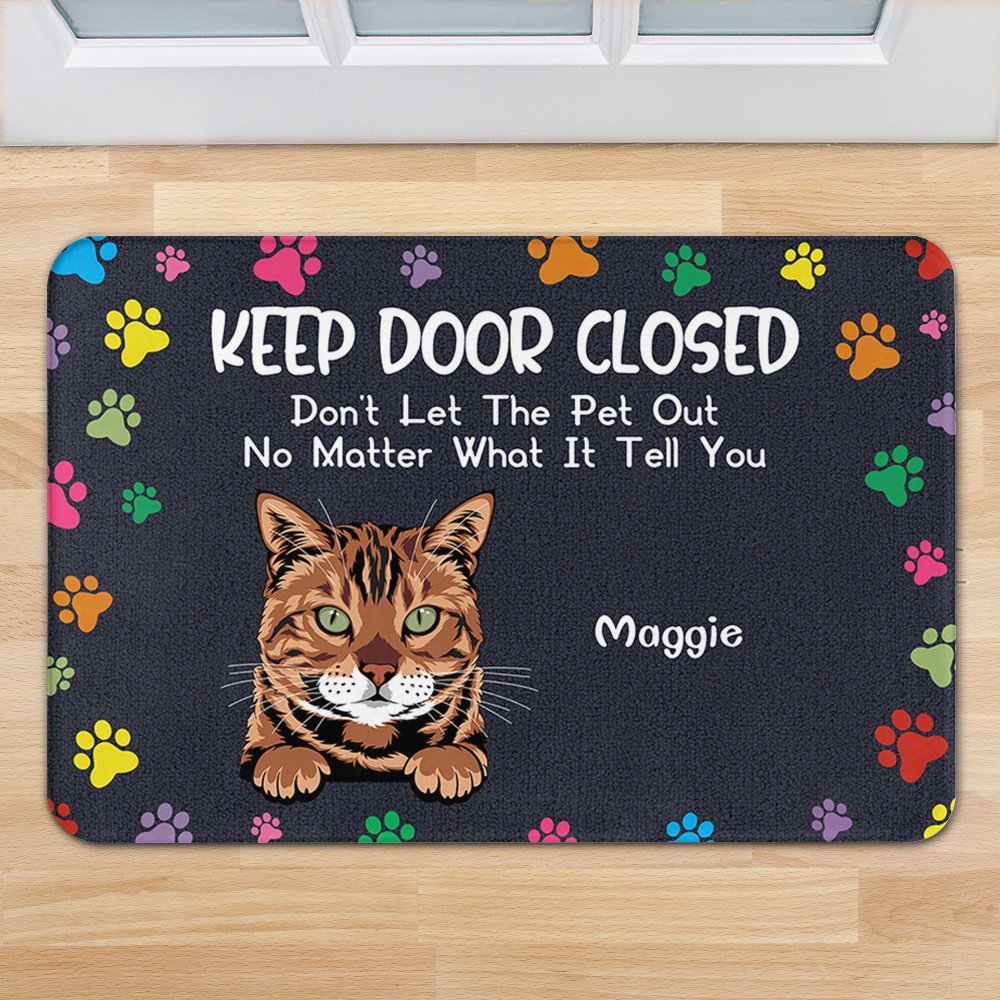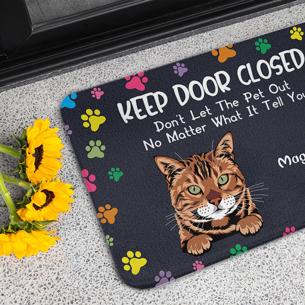 We hebben "Keep Door Closed Don't Let the Pets Out No Whatever What They Tell You" op de deurmat gedrukt. De leuke en geestige boodschap maakt de deurmat interessanter en drukt de liefde van huisdiereigenaren voor hun harige vrienden uit.