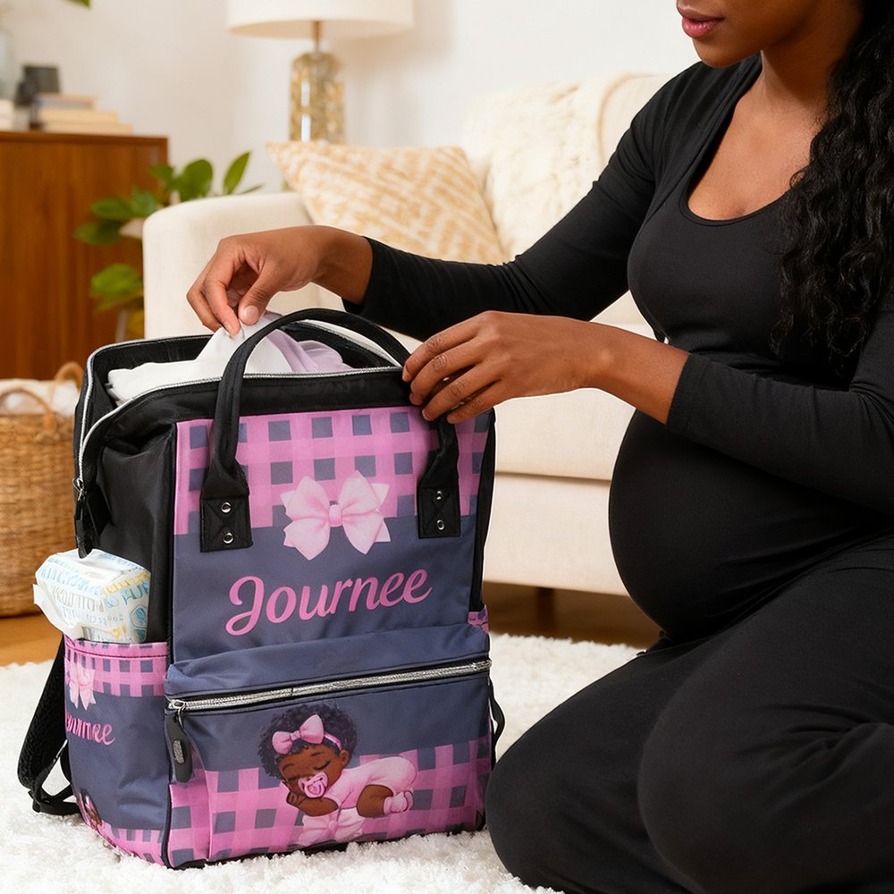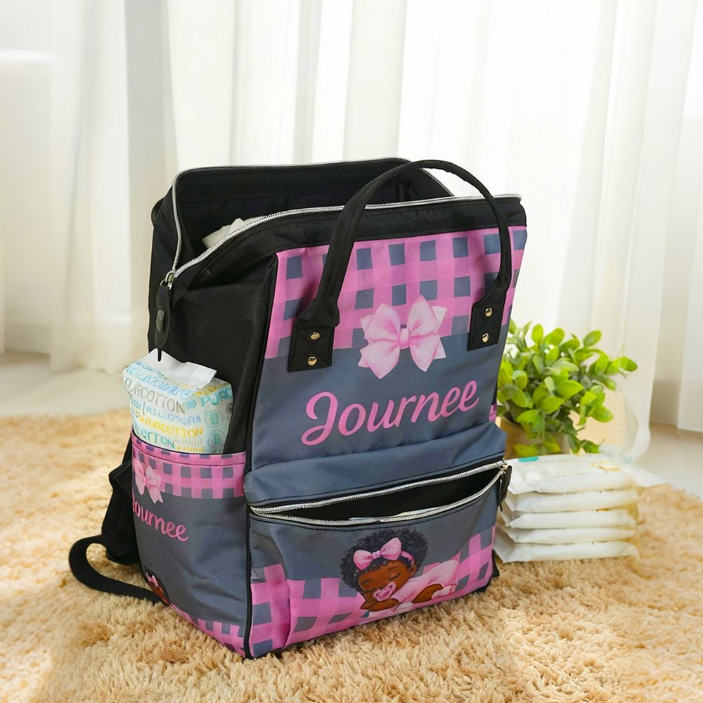 Versierd met schattige cartoonpatronen met een zwarte baby en geaccentueerd met een delicaat roze strikje, is deze luiertas ontworpen om het meisjeshart van elke moeder te bevredigen. De levendige kleuren en inclusieve ontwerpen voegen een vleugje zoete charme toe aan je ouderschapsreis.