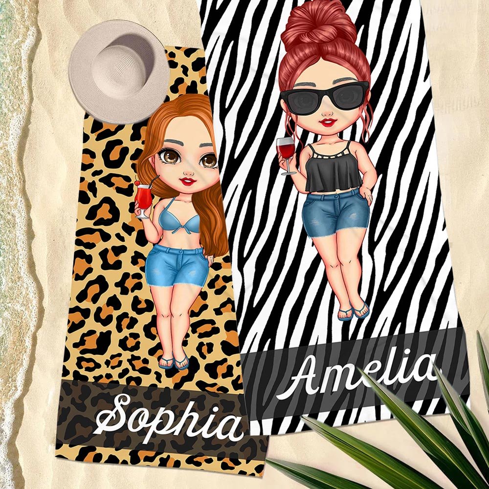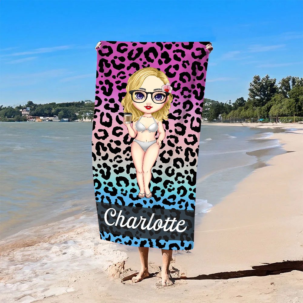 Het ontwerp van dit strandlaken is levendig en opvallend. Het heeft kostuums in strandvakantiestijl met modieuze achtergronden met luipaard en zebraprint. U kunt ook uw naam erop laten aanpassen. Speelse combinaties van kleuren en patronen voegen een leuk en stijlvol element toe aan uw uitstapje naar het strand.