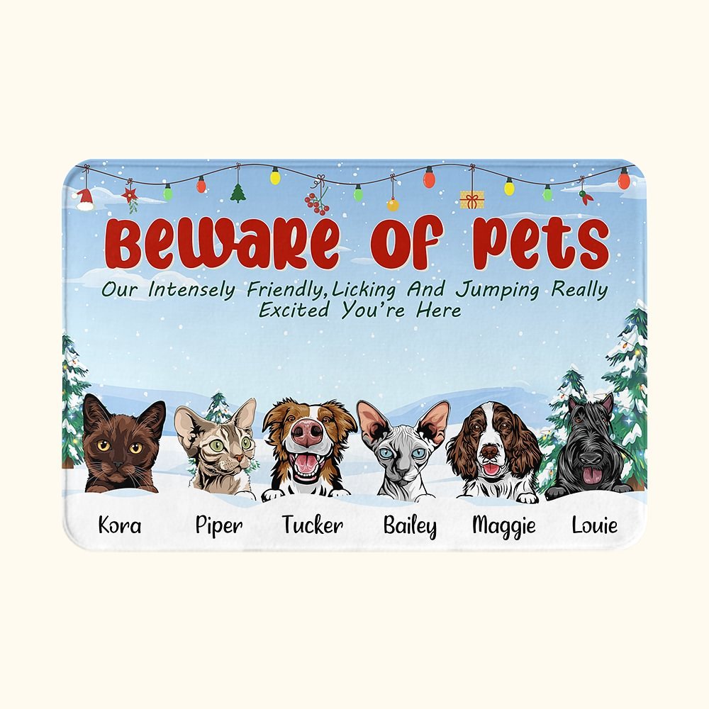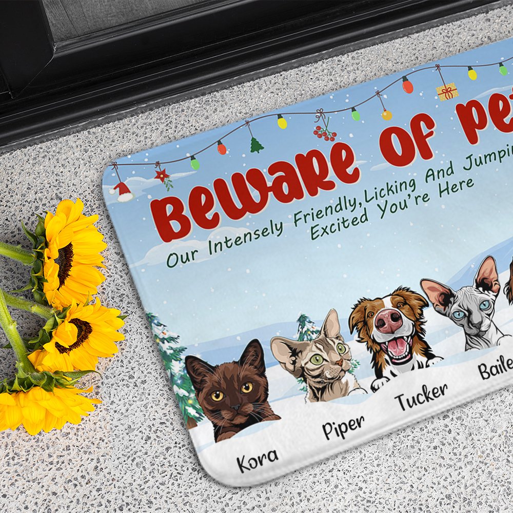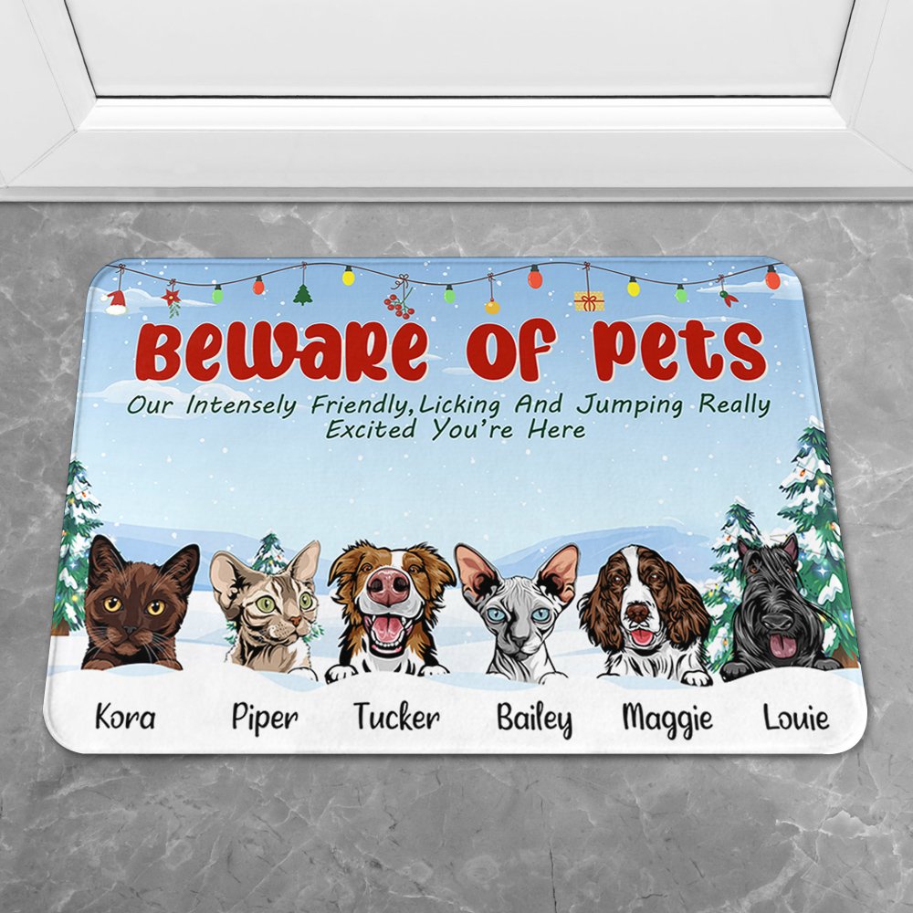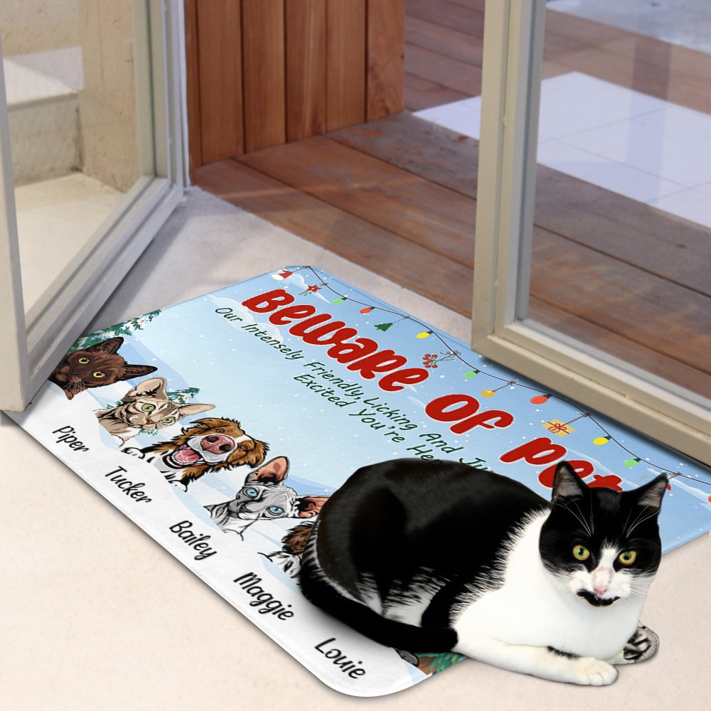 De boodschap "Our Intensely Friendly,Licking And Jumping Really Excited You're Here" is prachtig afgedrukt op de vloermat, wat betekent dat huisdieren ook menselijke familieleden zijn.