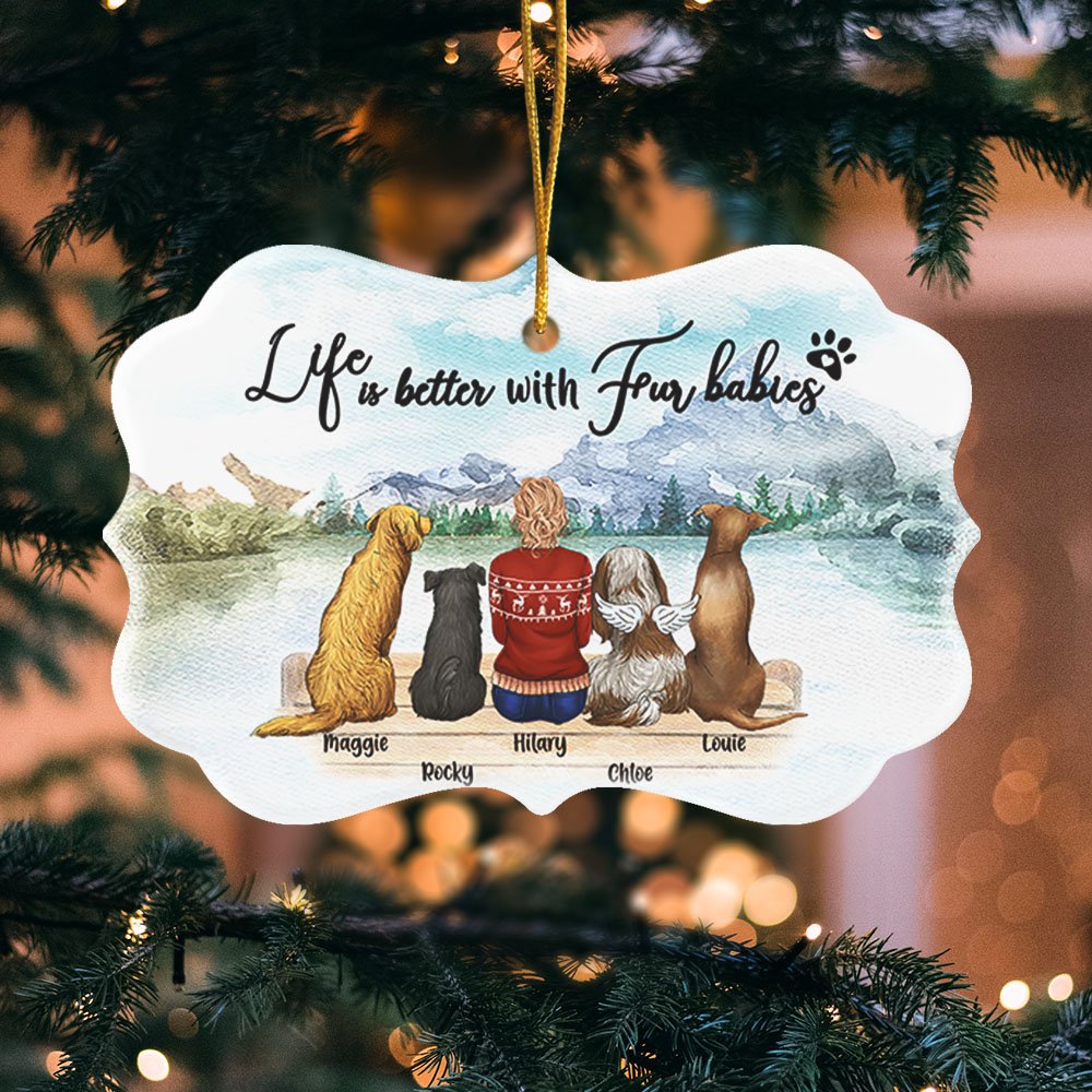 De boodschap "Life Is Better With Fur Baby/Babies" is prachtig afgedrukt op het ornament en herinnert aan de goede tijden die honden en baasje delen.