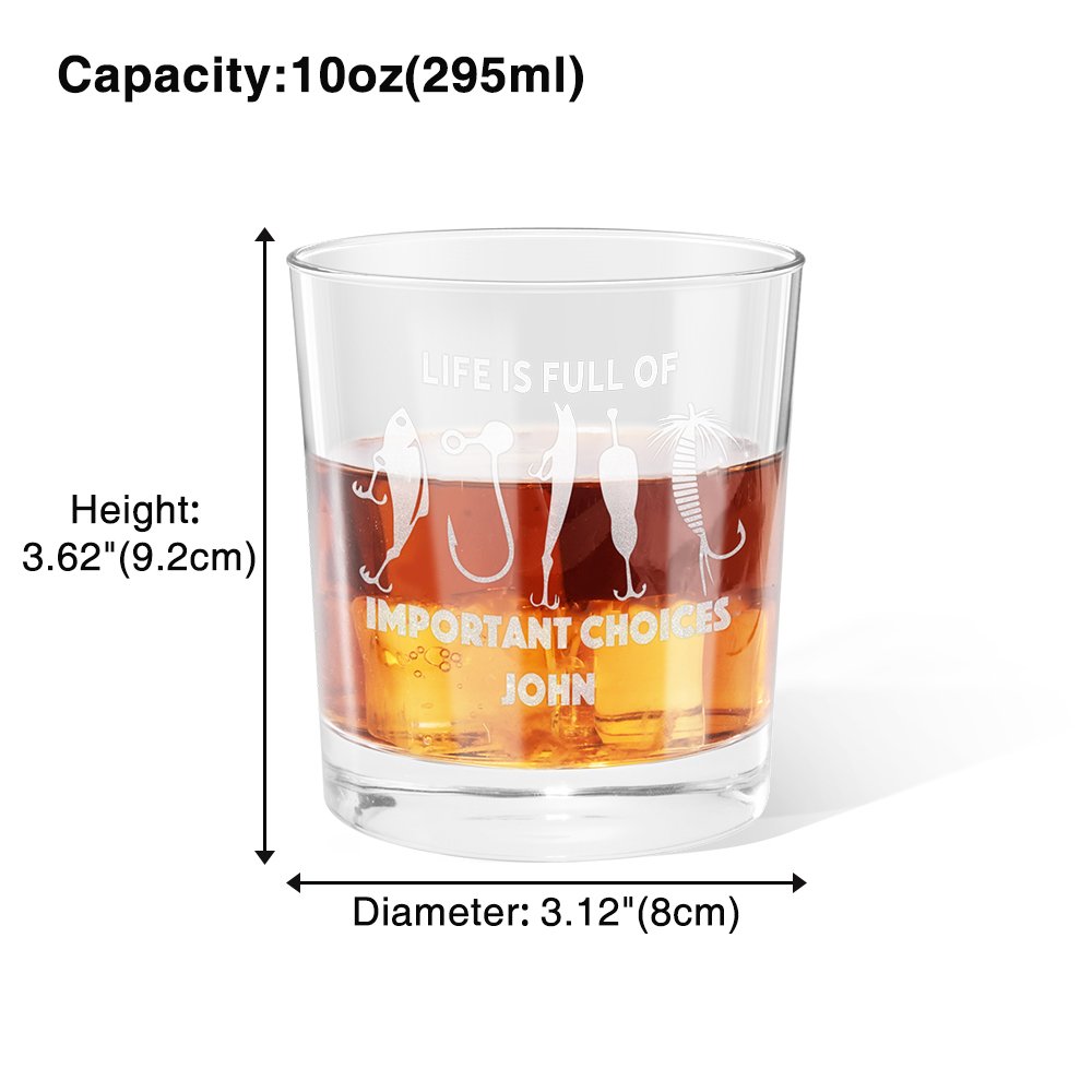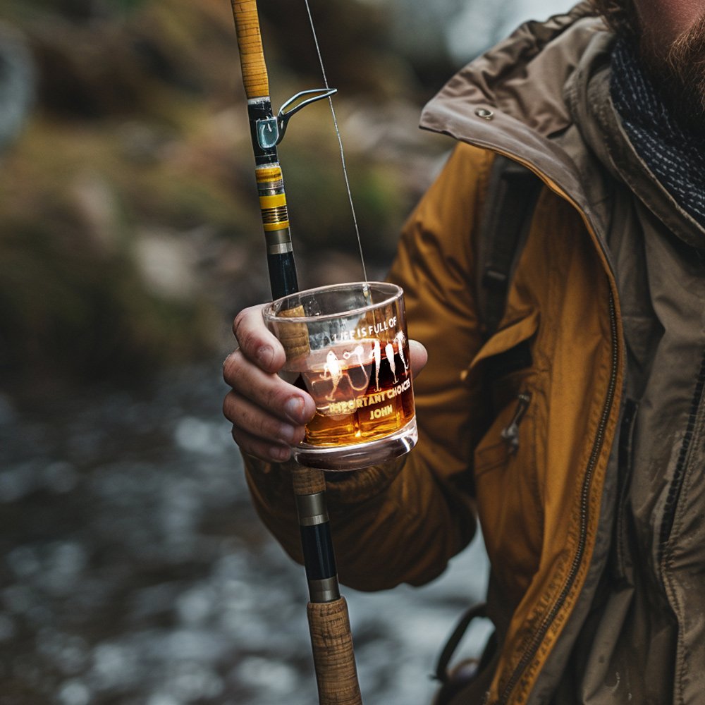 "LIFE IS FULL OF IMPORTANT CHOICES" is prachtig gegraveerd op het glas, vergezeld van een grappige illustratie met een visthema. Het geeft de essentie van de levensstijl van het vissen weer en herinnert ons er op humoristische wijze aan dat het leven, net als het kiezen van een vishaak, vol keuzes zit en dat verschillende keuzes tot verschillende resultaten zullen leiden. Met de optie om het glas aan te passen met een naam of initialen, kun je een echt uniek cadeau creëren dat is afgestemd op de ontvanger.