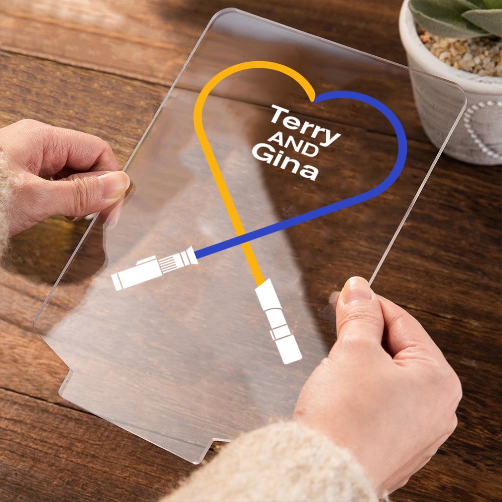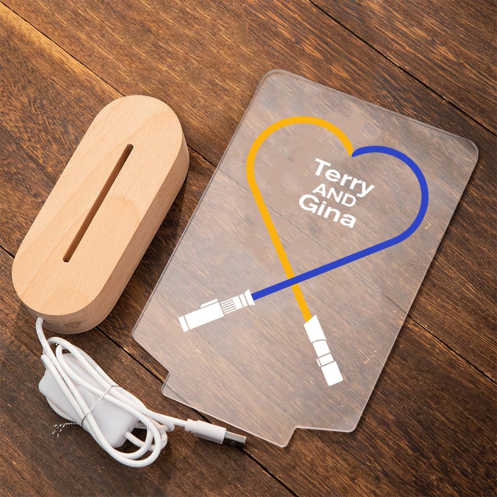 Illuminate your love story with this striking night light, enhanced by the lightsaber heart-shaped design. Customize this night light with your and your partner's or another couple's names to create a truly special and personalized gift. Capture a beautiful moment that represents your love story and display it proudly on this stunning night light.